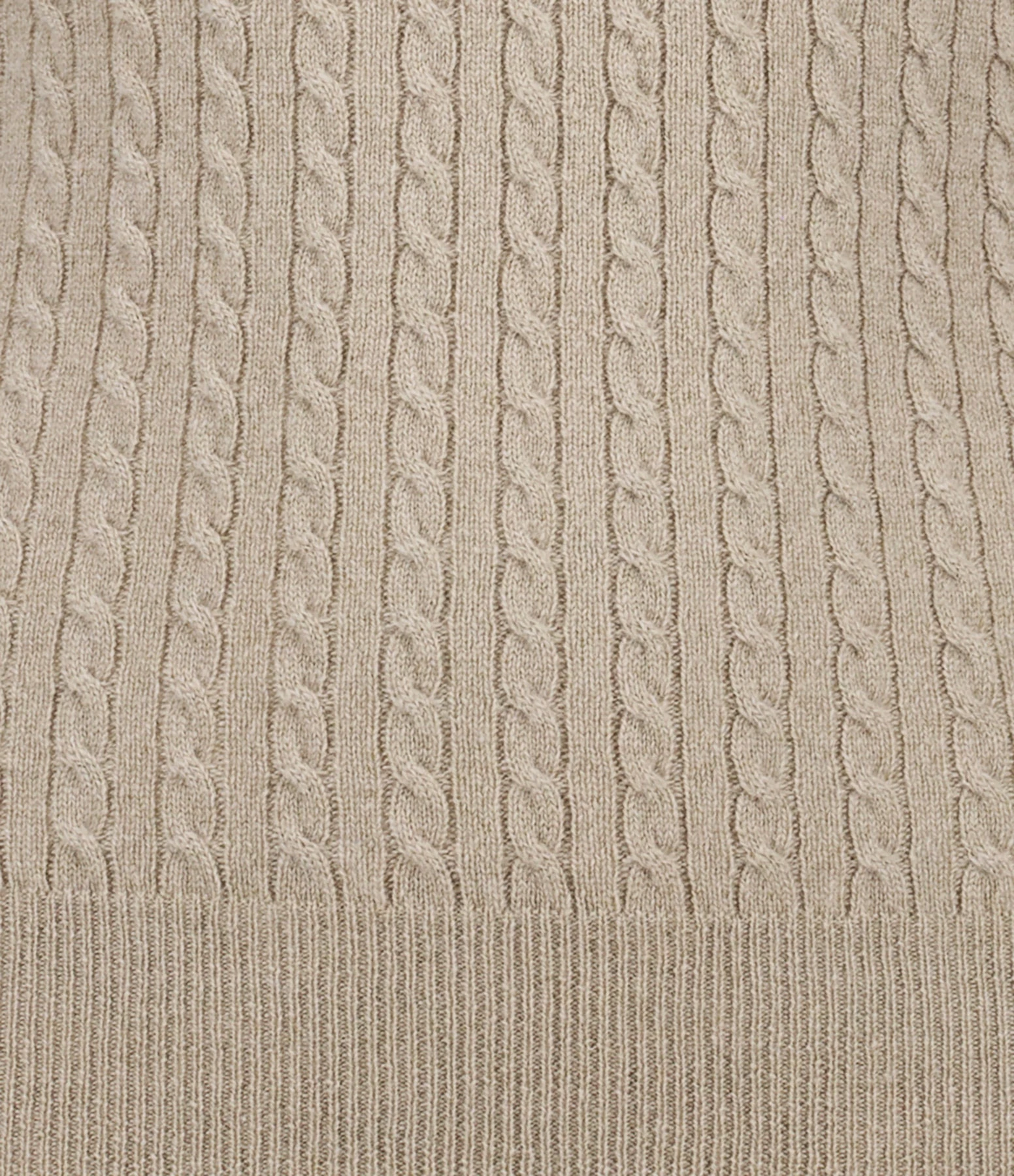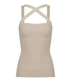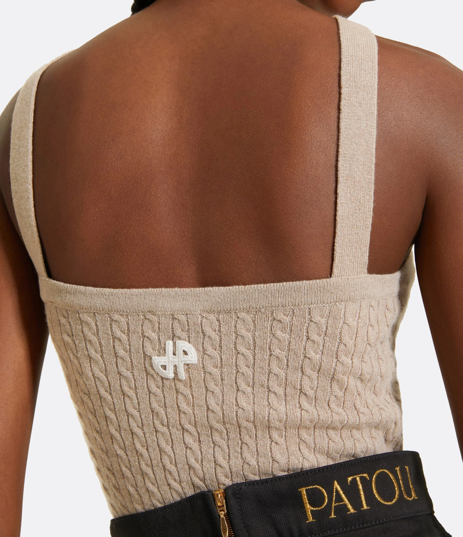 Top en laine et cachemire beige. Maille torsadée. Bretelles croisées sur le devant. Décolleté cœur. Monogramme JP au dos.