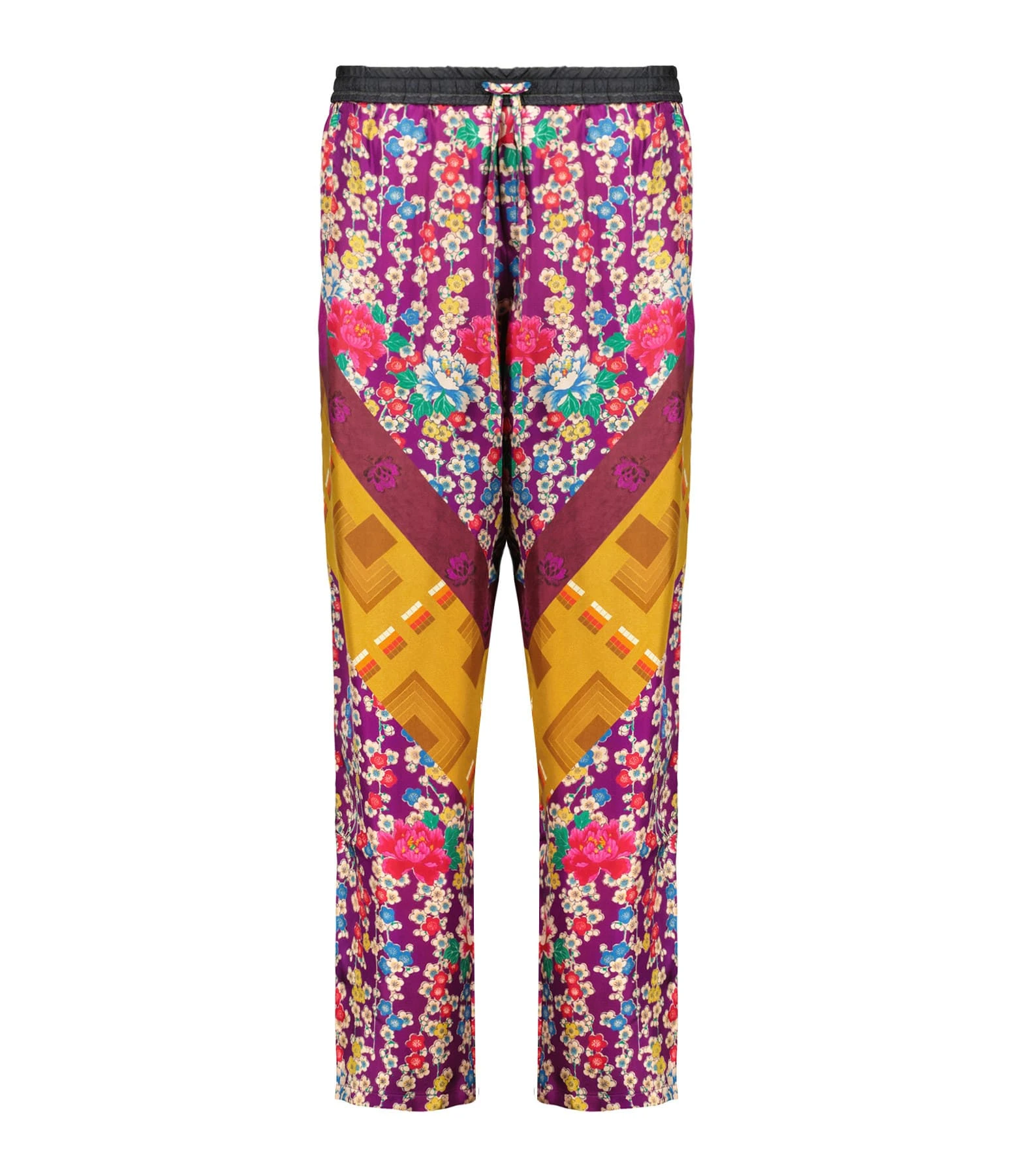 Pantalon en soie à motif floral multicolore. Taille élastiquée avec liens de serrage. Poches latérales. Coupe droite et ample. Base droite.