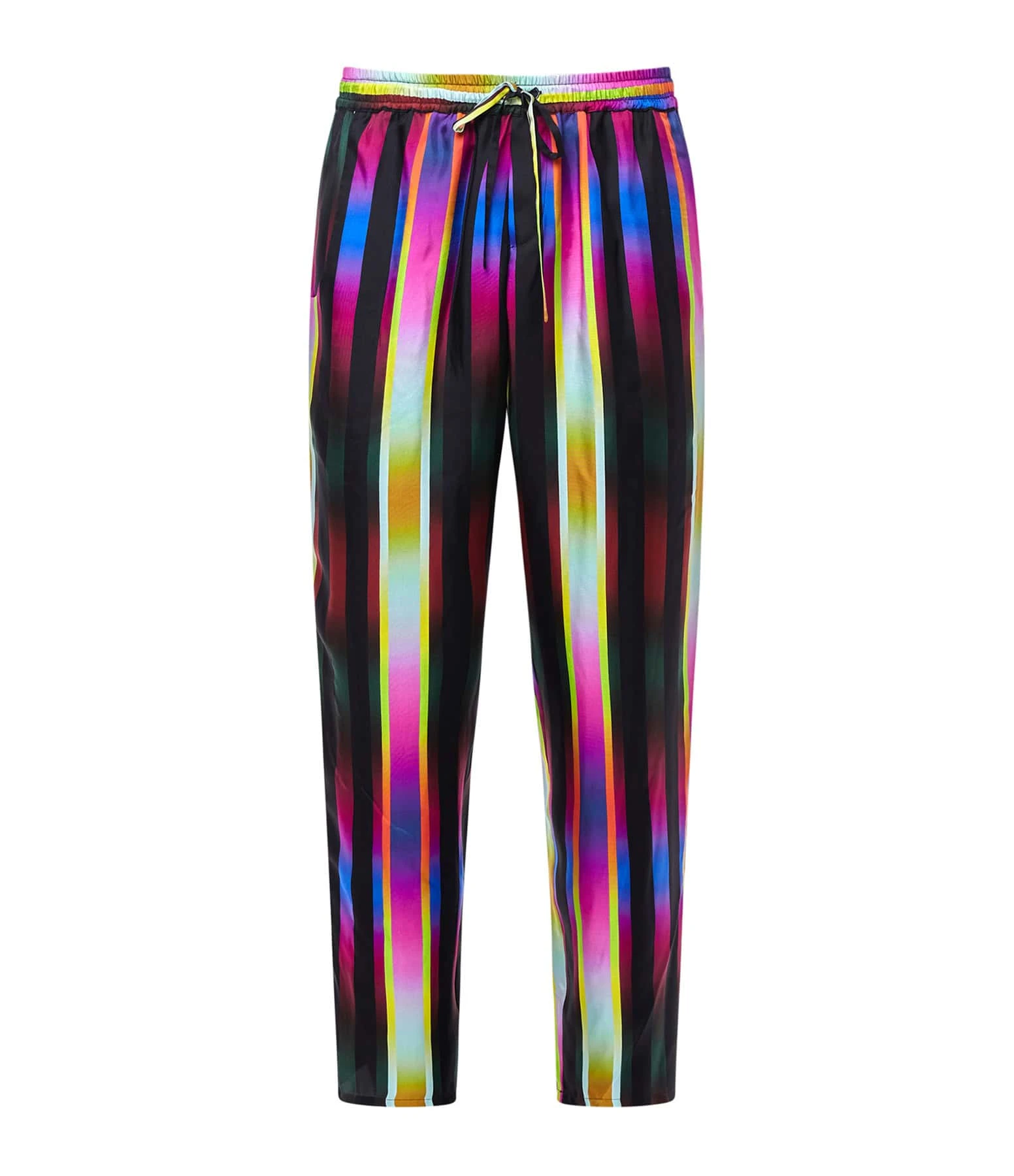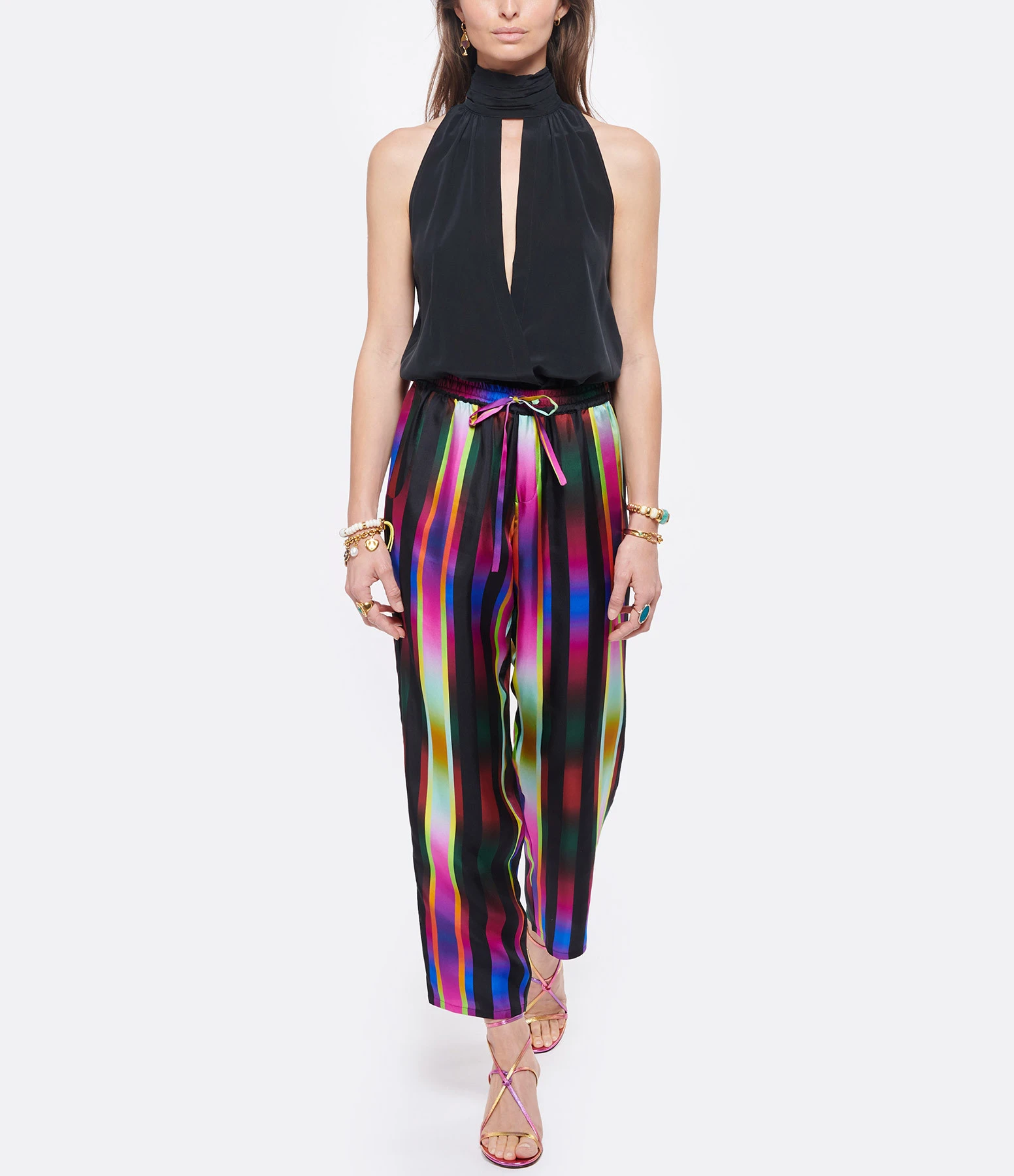 Pantalon multicolore en soie à rayures verticales. Taille élastiquée avec liens de serrage. Poches latérales. Coupe droite et ample.