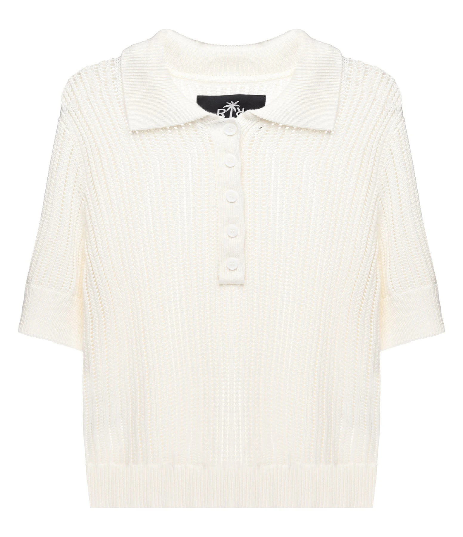 Polo blanc effet crochet. Ajouré. Col polo avec fermeture par boutons blancs sur le devant. Manches courtes. Coupe droite. Base droite.