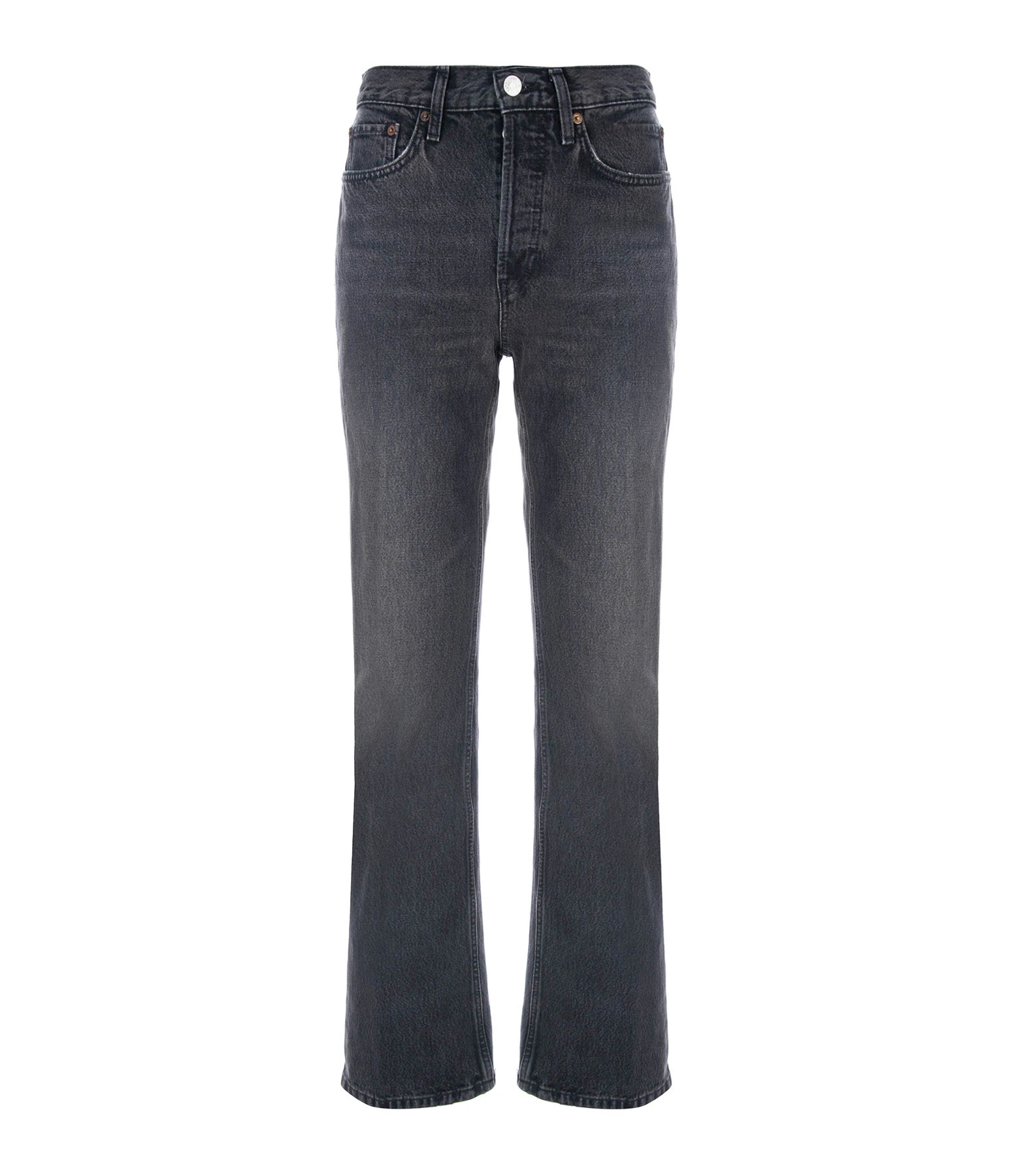 Jean bootcut en denim noir délavé. Taille haute. Fermeture boutonnée. Cinq poches. Coupe droite, évasée sur le bas.
