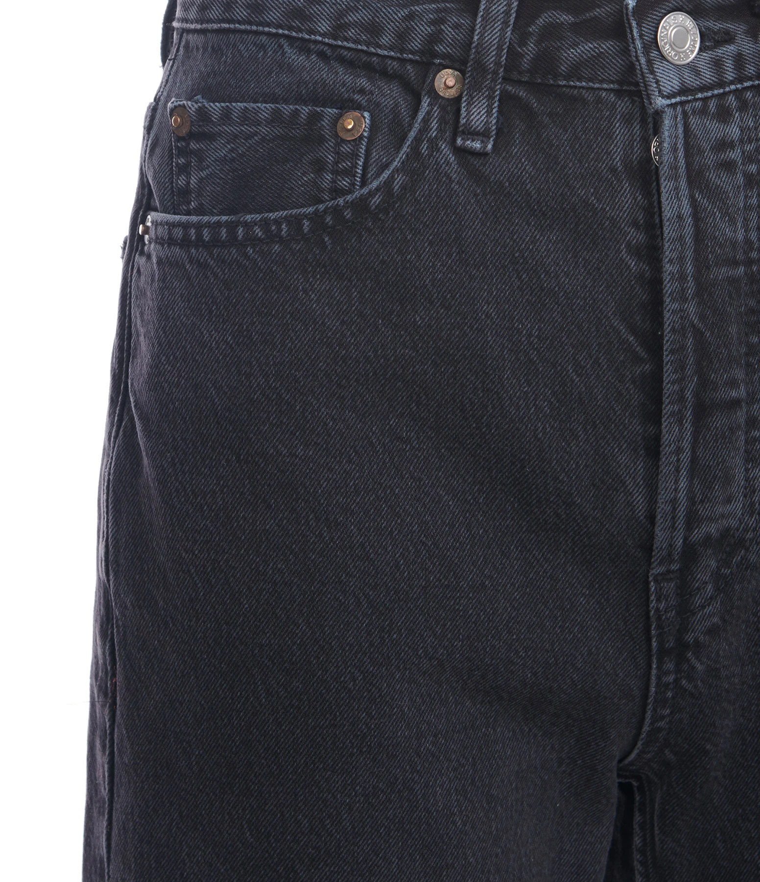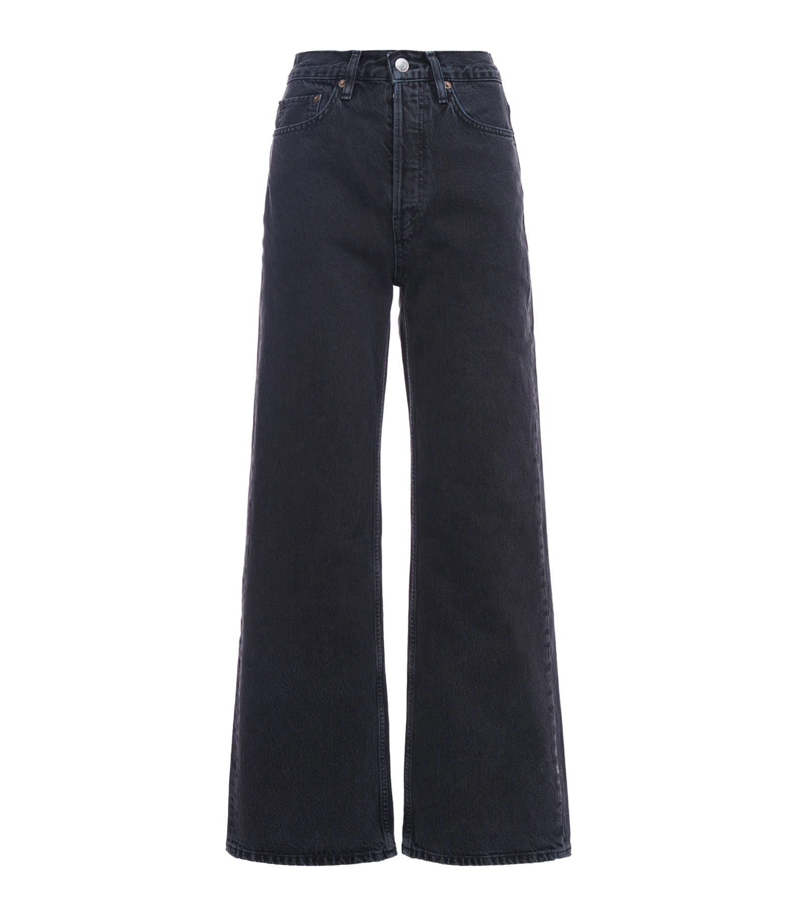 Jean bootcut en denim noir délavé. Taille haute. Fermeture boutonnée. Cinq poches. Coupe droite, évasée sur le bas.