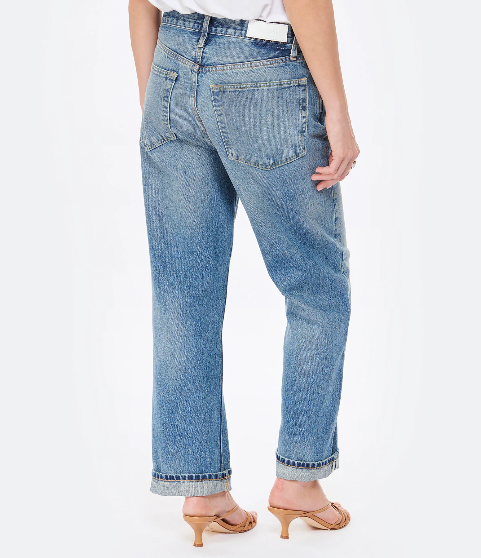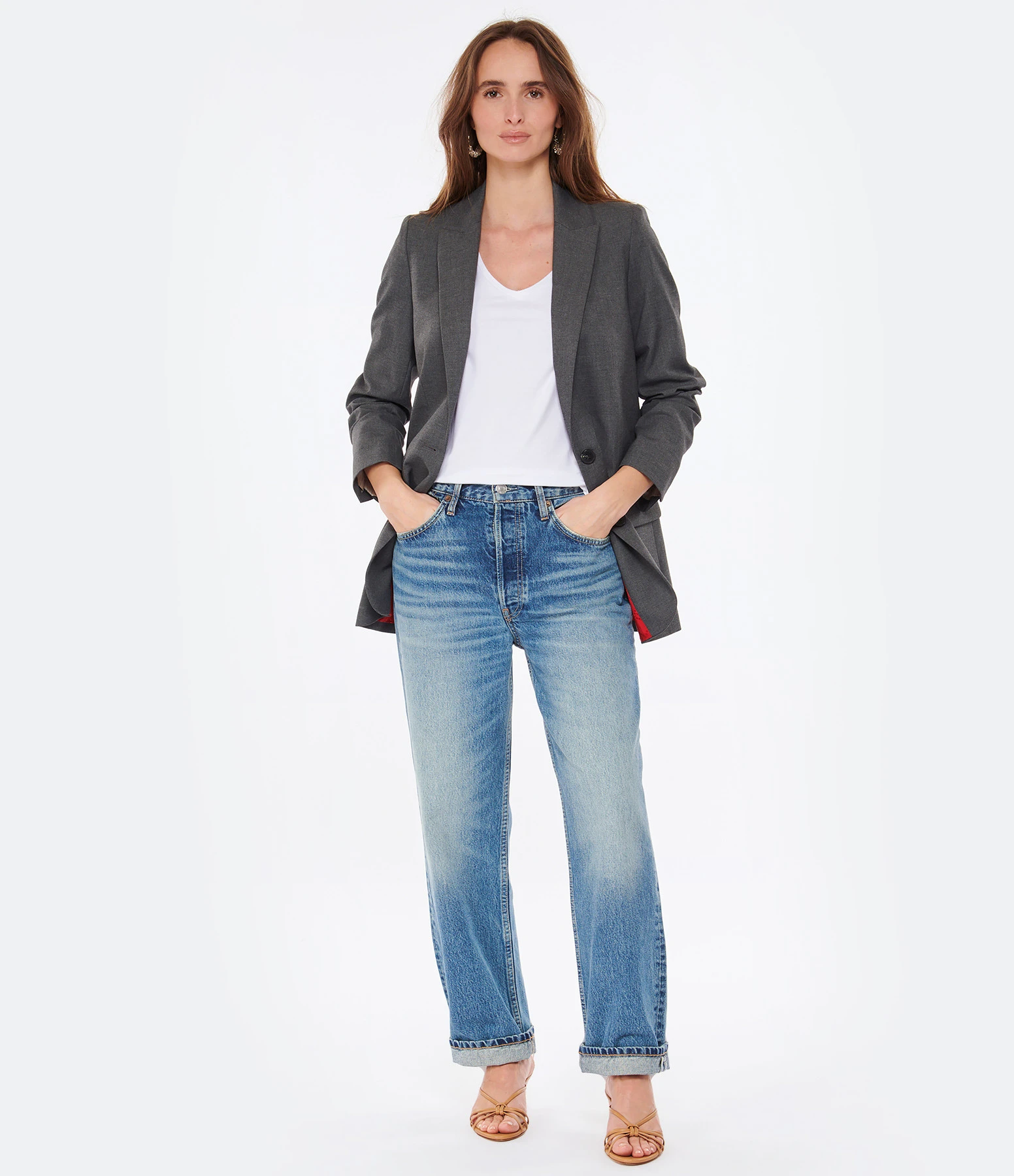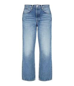 Jean en coton bleu effet délavé. Braguette boutonnée. Taille haute avec passants pour ceinture. Cinq poches plaquées. Patch en cuir lisse blanc avec inscription « RE/DONE » cousu dans le dos. Coupe boyfriend. Base droite.
