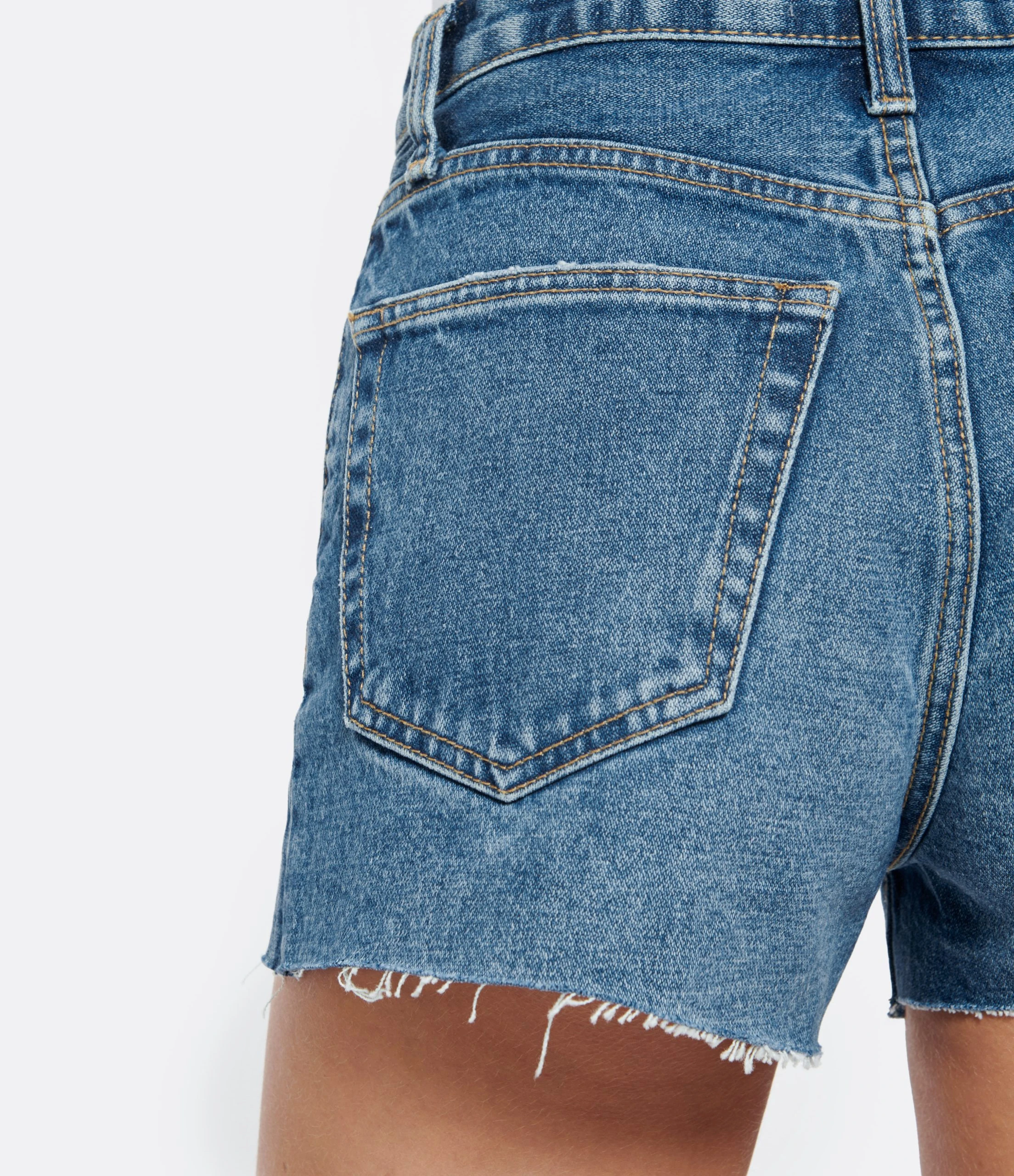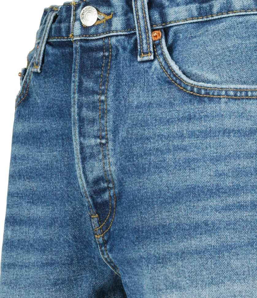 Short court en denim bleu délavé. Braguette boutonnée. Boutons métalliques gravés de l’inscription » RE/DONE ORIGINALS ». Taille haute avec passants pour ceinture. Deux poches italiennes et une poche à gousset. Empiècement dans le dos. Jacron dans le dos. Deux poches plaquées dans le dos. Coupe ajustée. Base droite avec bords francs.