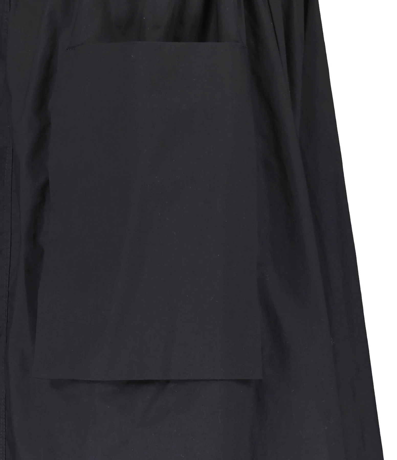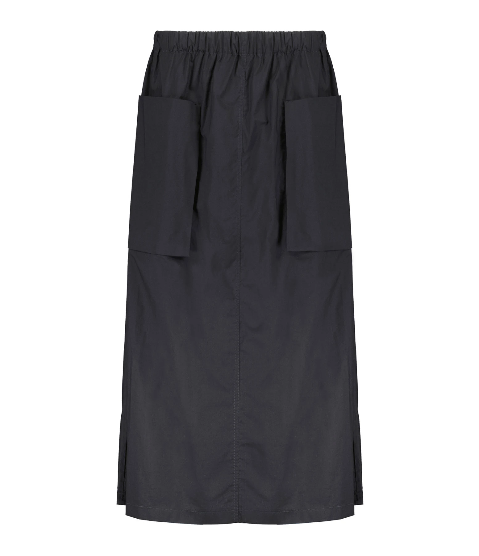 Jupe mi-longue noire. Deux poches plaquées sur le devant. Taille élastiquée. Coupe évasée. Base droite.