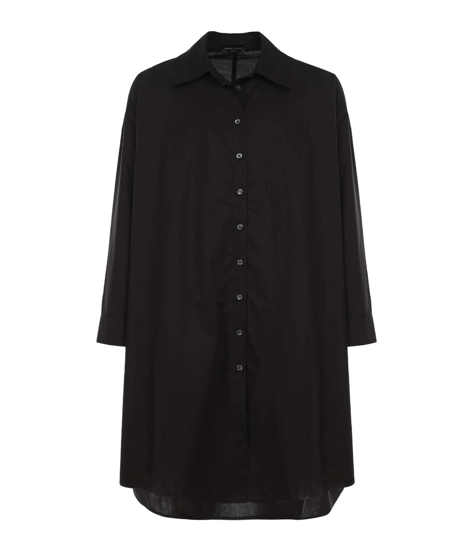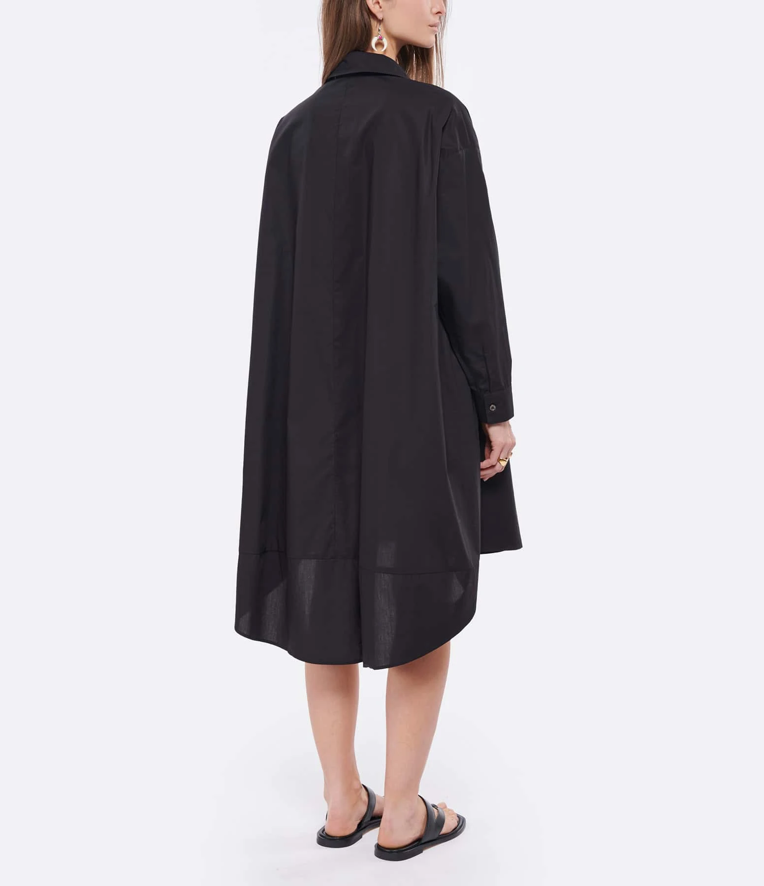 Robe chemise en coton noir. Col chemise. Manches longues. Fermeture boutonnée. Deux poches fendues. Coupe ample. Base droite, plus longue à l’arrière.
