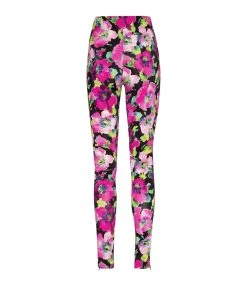 Pantalon slim effet legging à imprimé fleuri rose. Taille élastiquée. Coupe droite. Base droite.