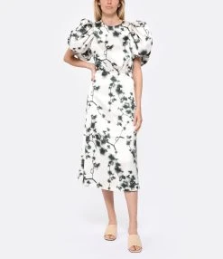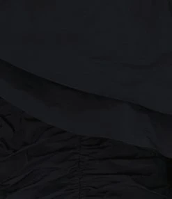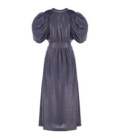 Robe midi bleu nuit métallisé. Col rond avec liens à nouer dans la nuque. Dos échancré. Manches coutes ballon. Taille resserrée, froncée et élastiquée dans le dos avec liens à nouer. Coupe buste droite. Coupe jupe évasée. Doublée.
