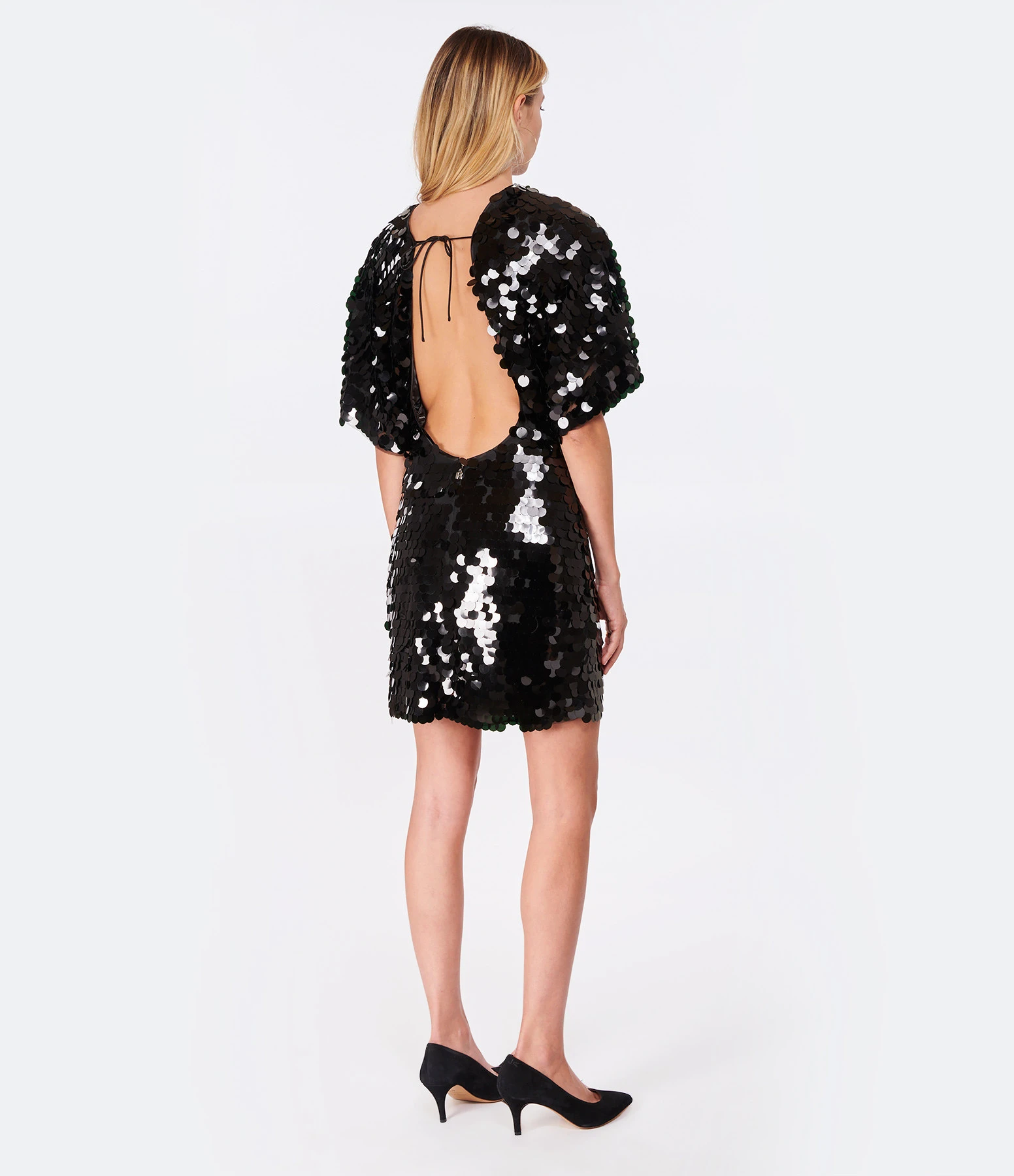 Robe courte en sequins noirs. Col rond. Dos échancré arrondi avec un lien à nouer dans al nuque Manches courtes évasées. Coupe près du corps. Base droite. Doublée.