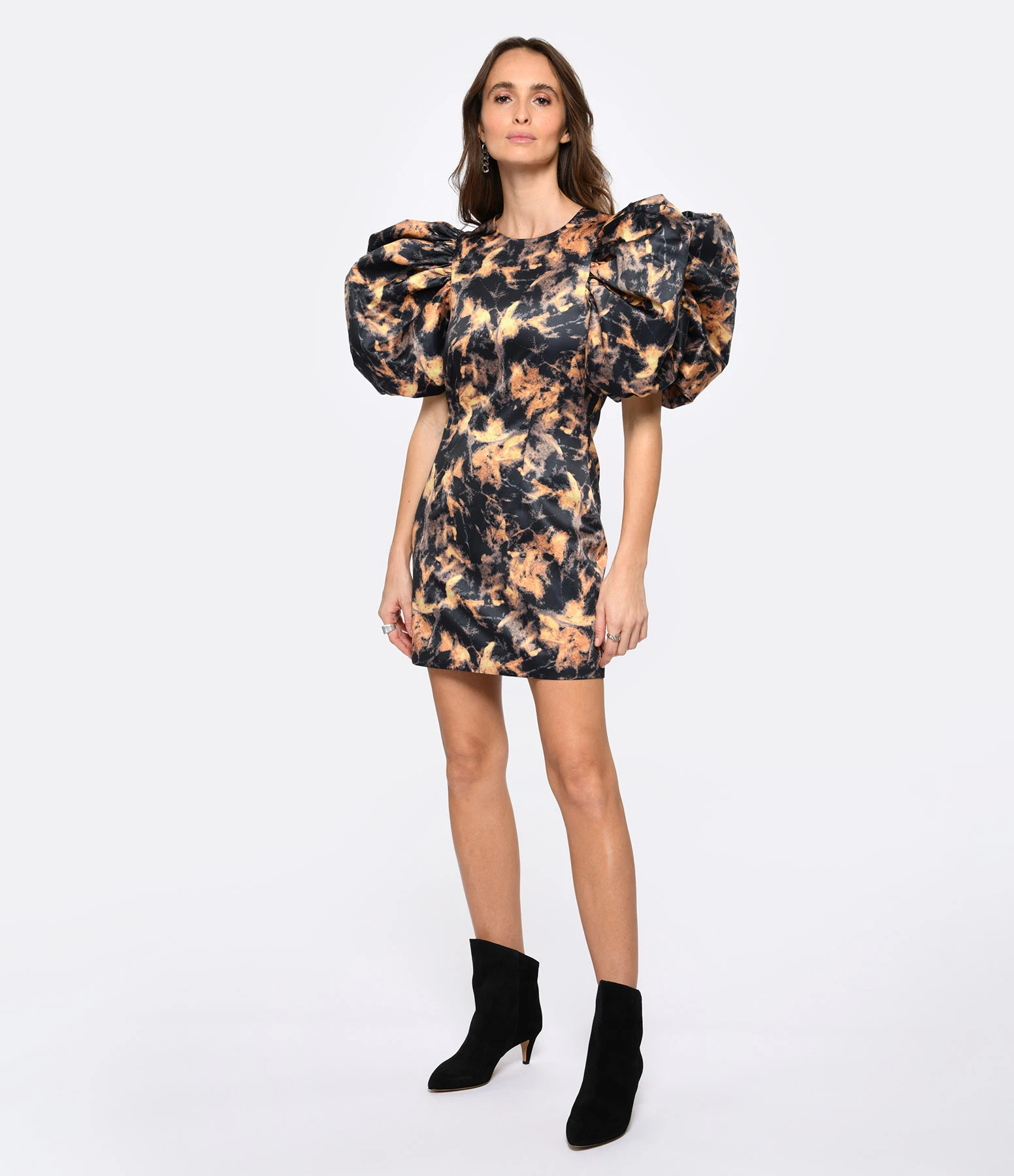 Robe courte en satin imprimé à motif flamme dans des tons noir et orange. Col rond. Manches courtes ballon. Fermeture zippée invisible dans le dos. Coupe près du corps. Base droite. Doublée.