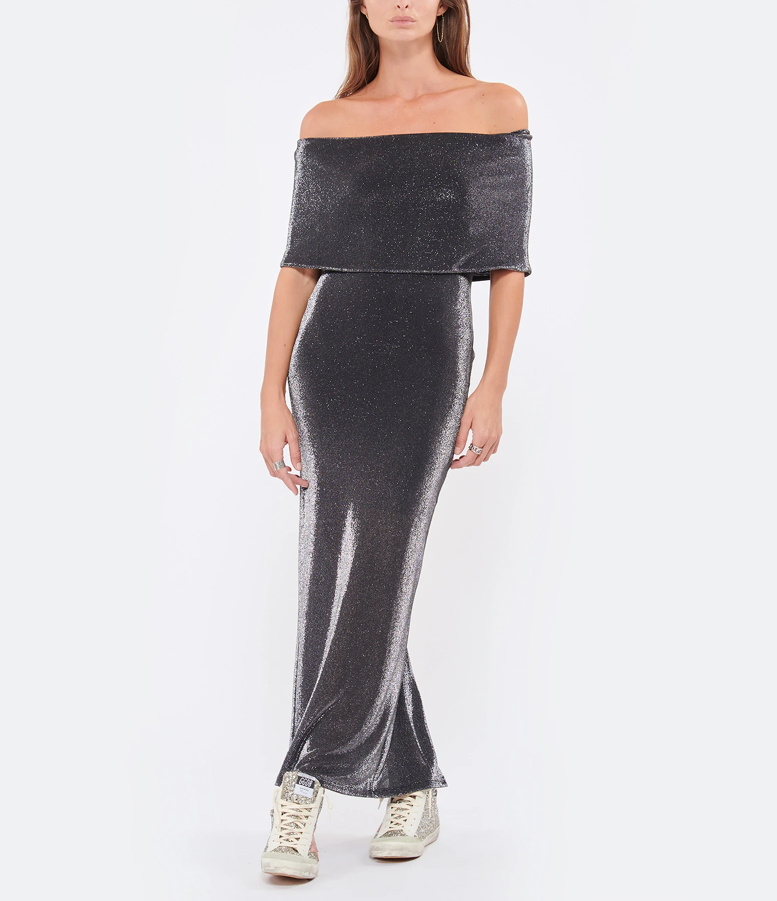 Robe longue en jersey noir métallisé. Encolure Bardot. Sans manches. Fermeture zippée invisible latérale. Fente milieu dos. Coupe près du corps. Base droite. Doublée.