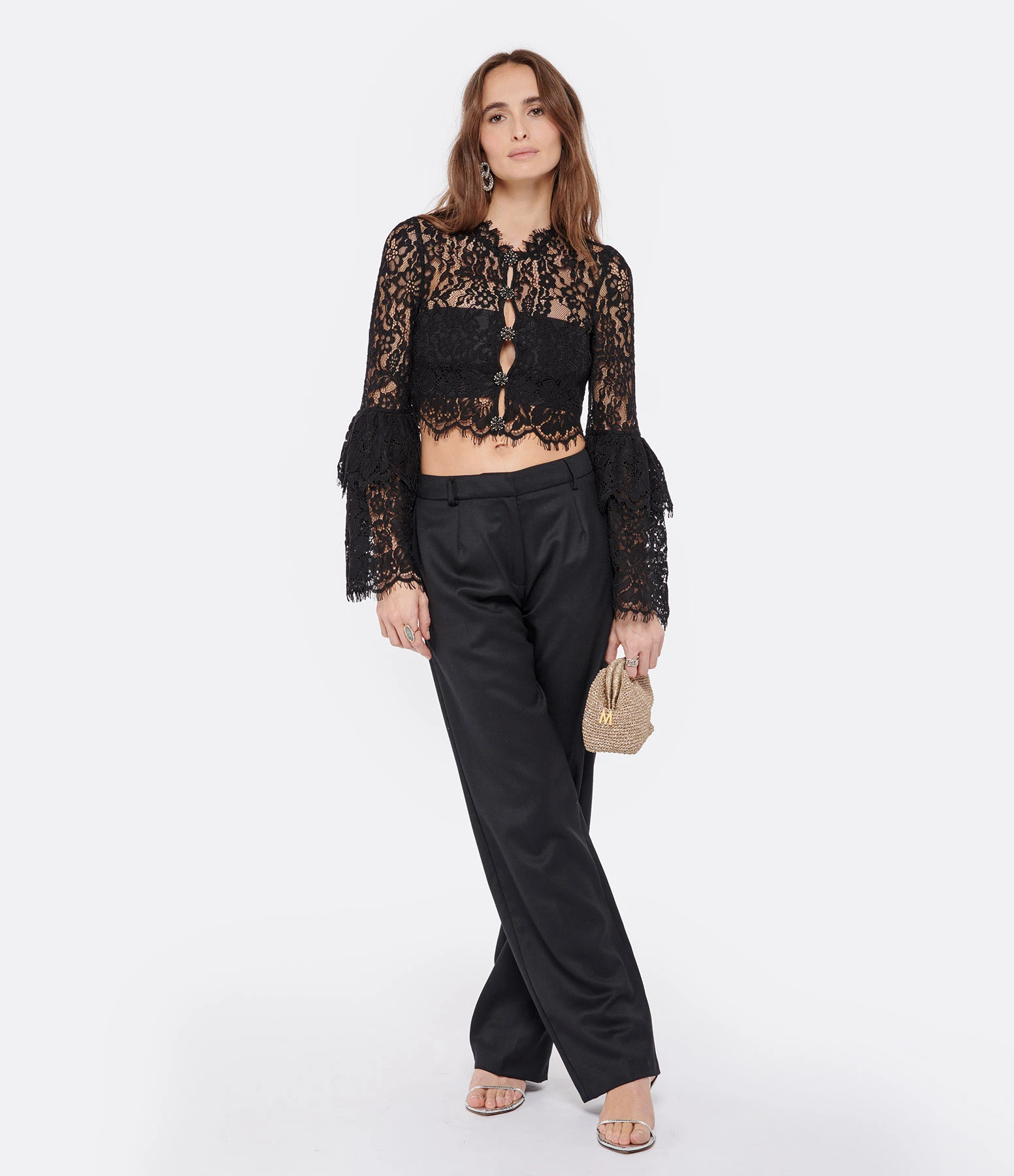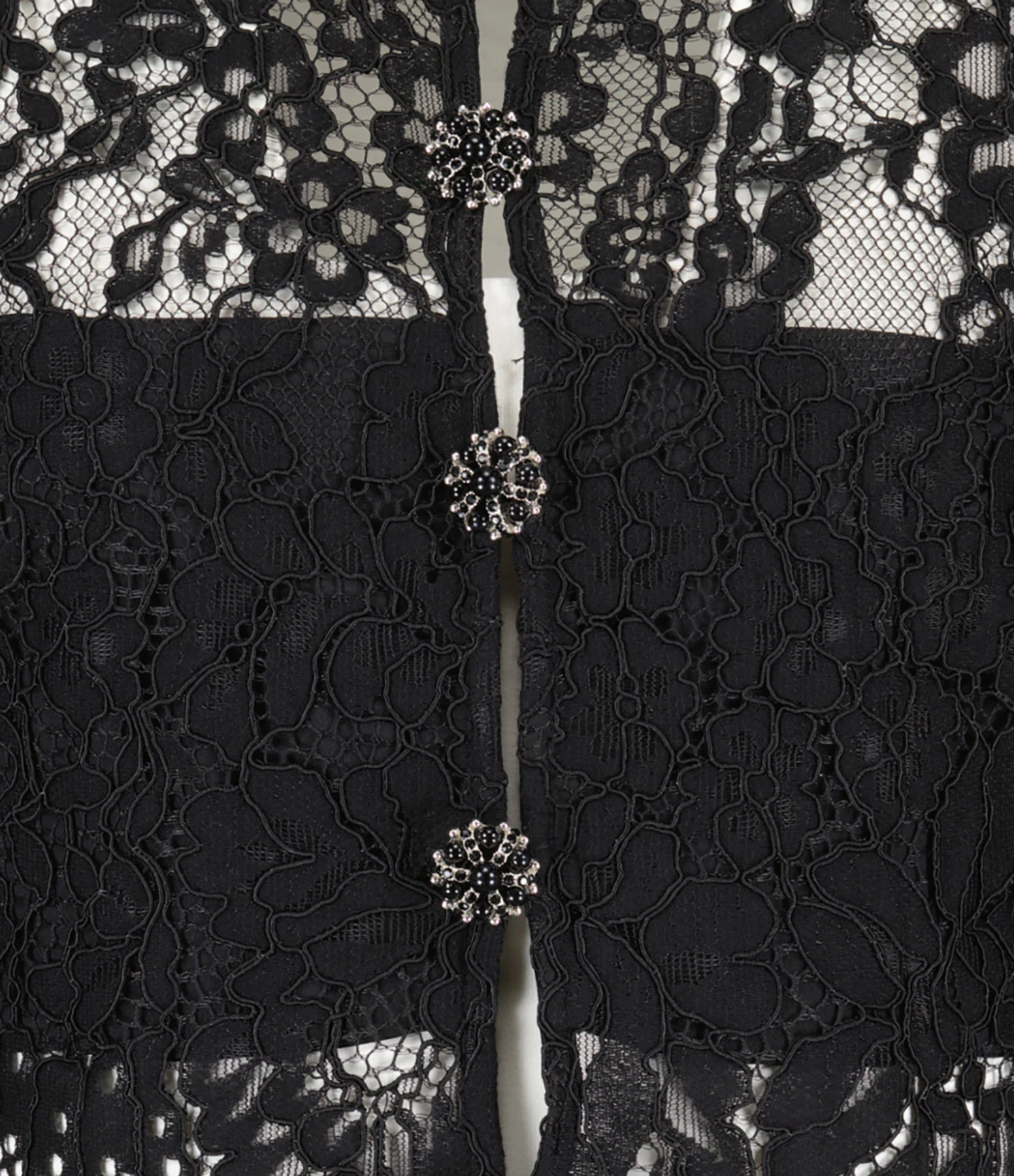 Top court noir en dentelle de coton. Manches longues larges avec volants au bout. Col rond. Fermeture boutonnée sur le devant. Gros boutons effet diamant noir et argenté. Doublé au niveau de la poitrine.