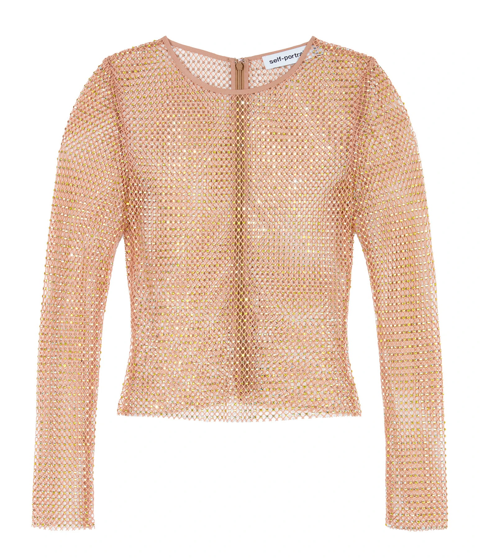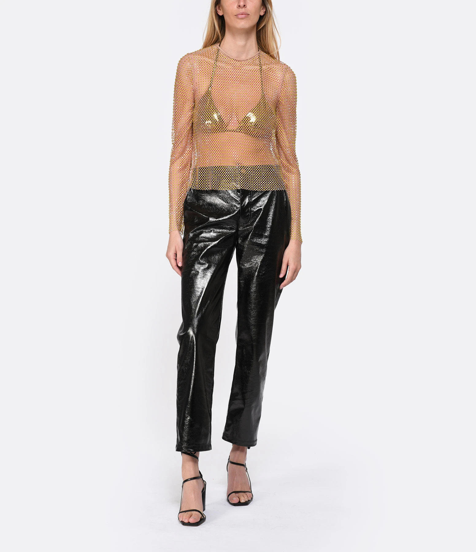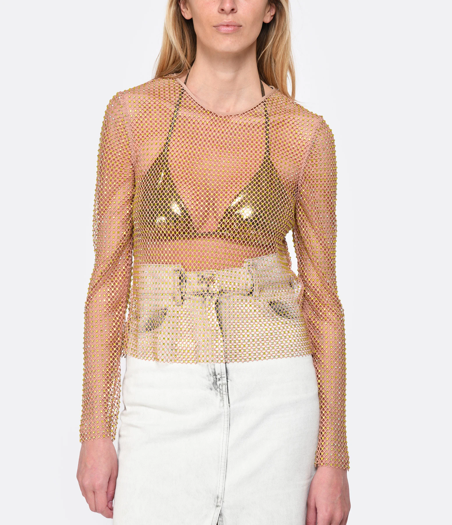Top en résille beige et strass jaune. Col rond fermé par une agrafe dans le dos. Manches longues. Coupe droite. Base droite.