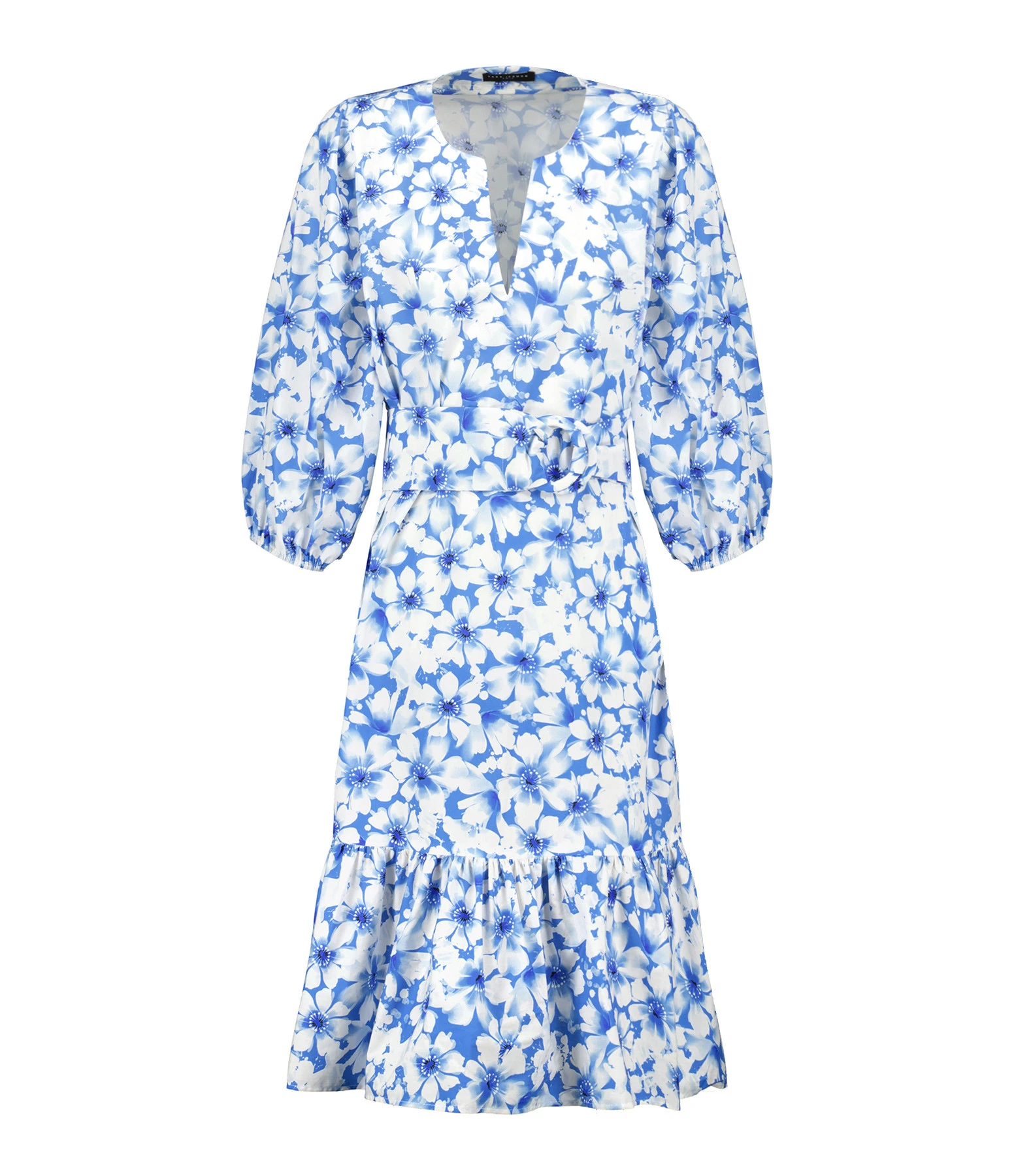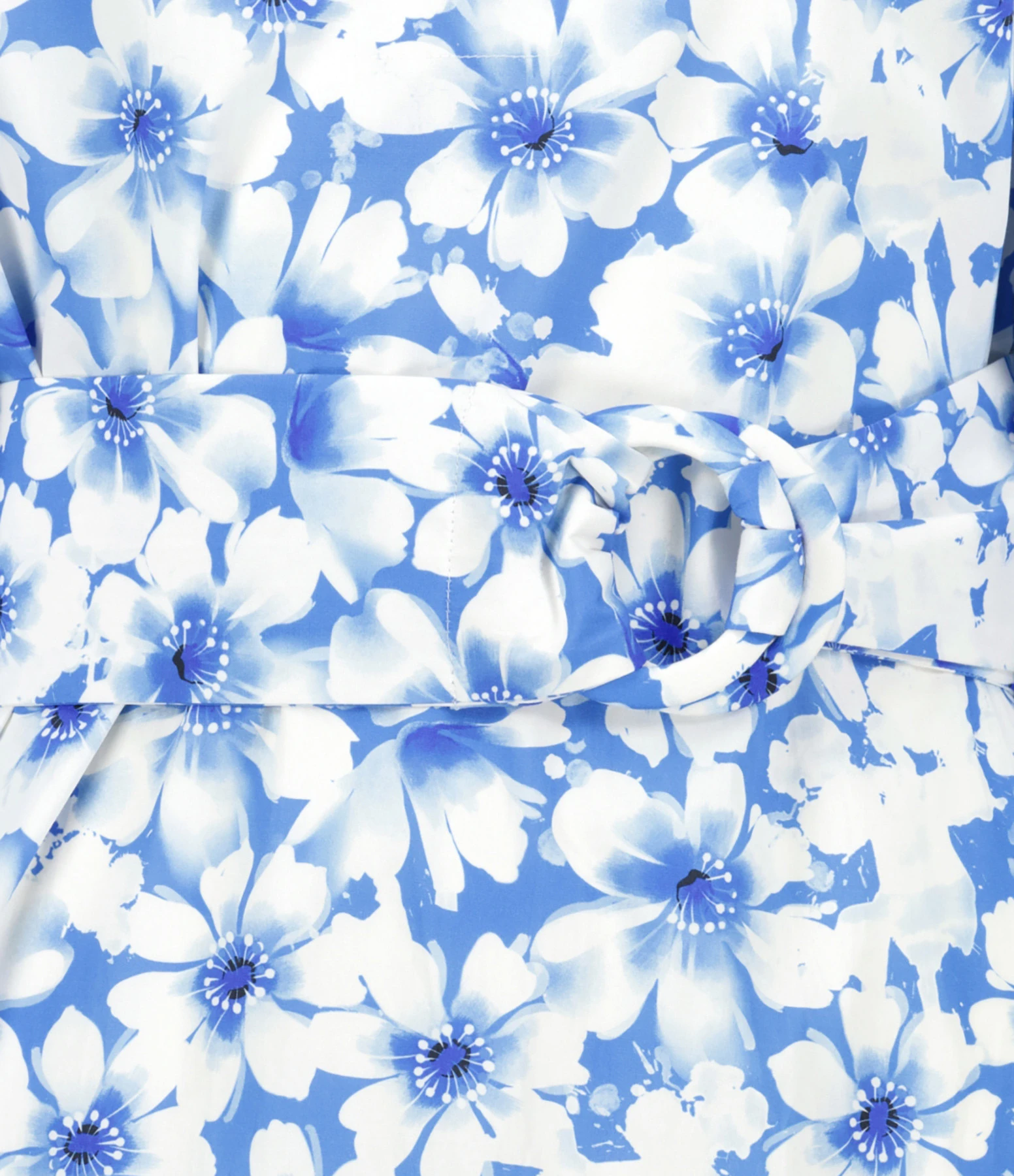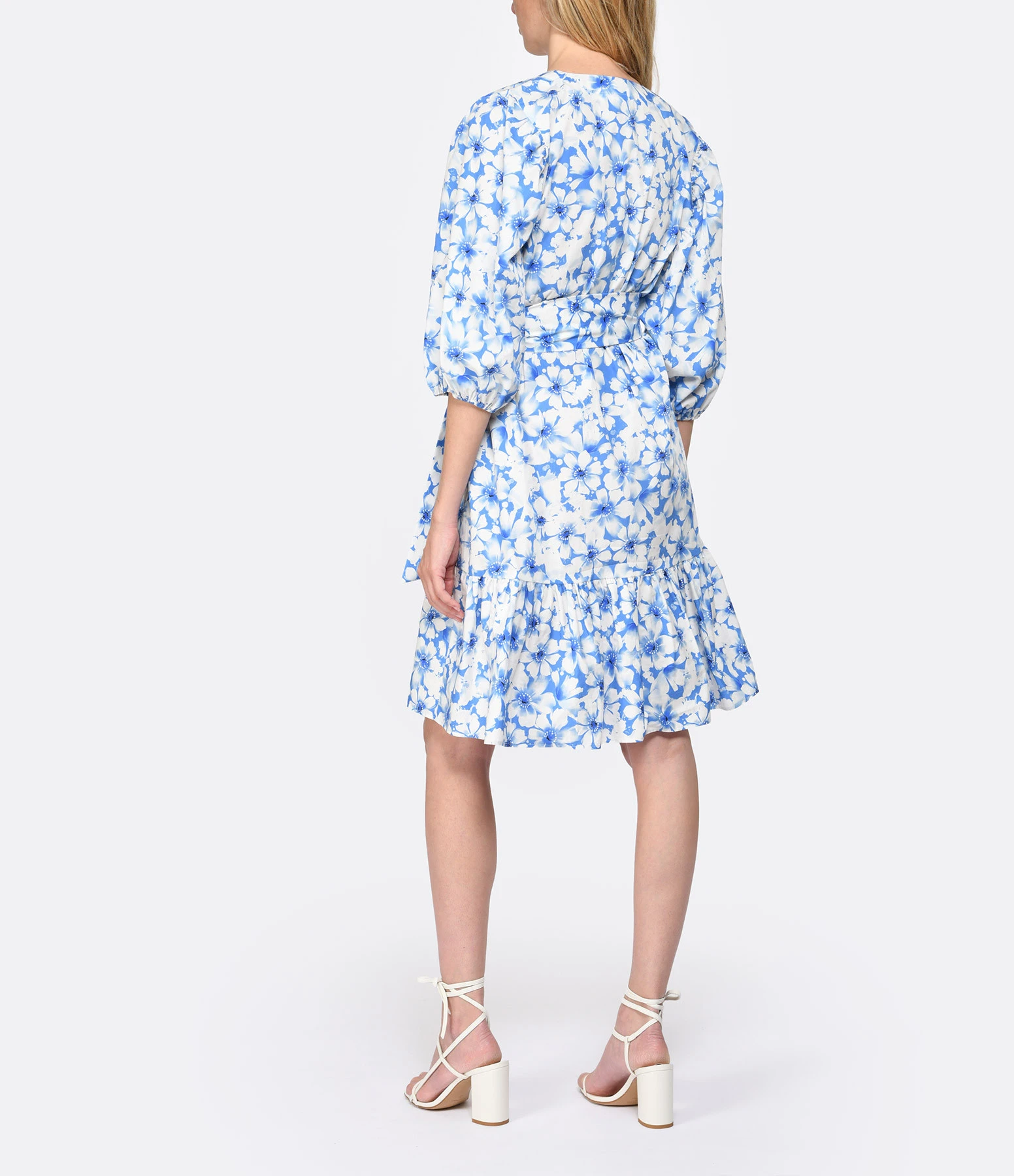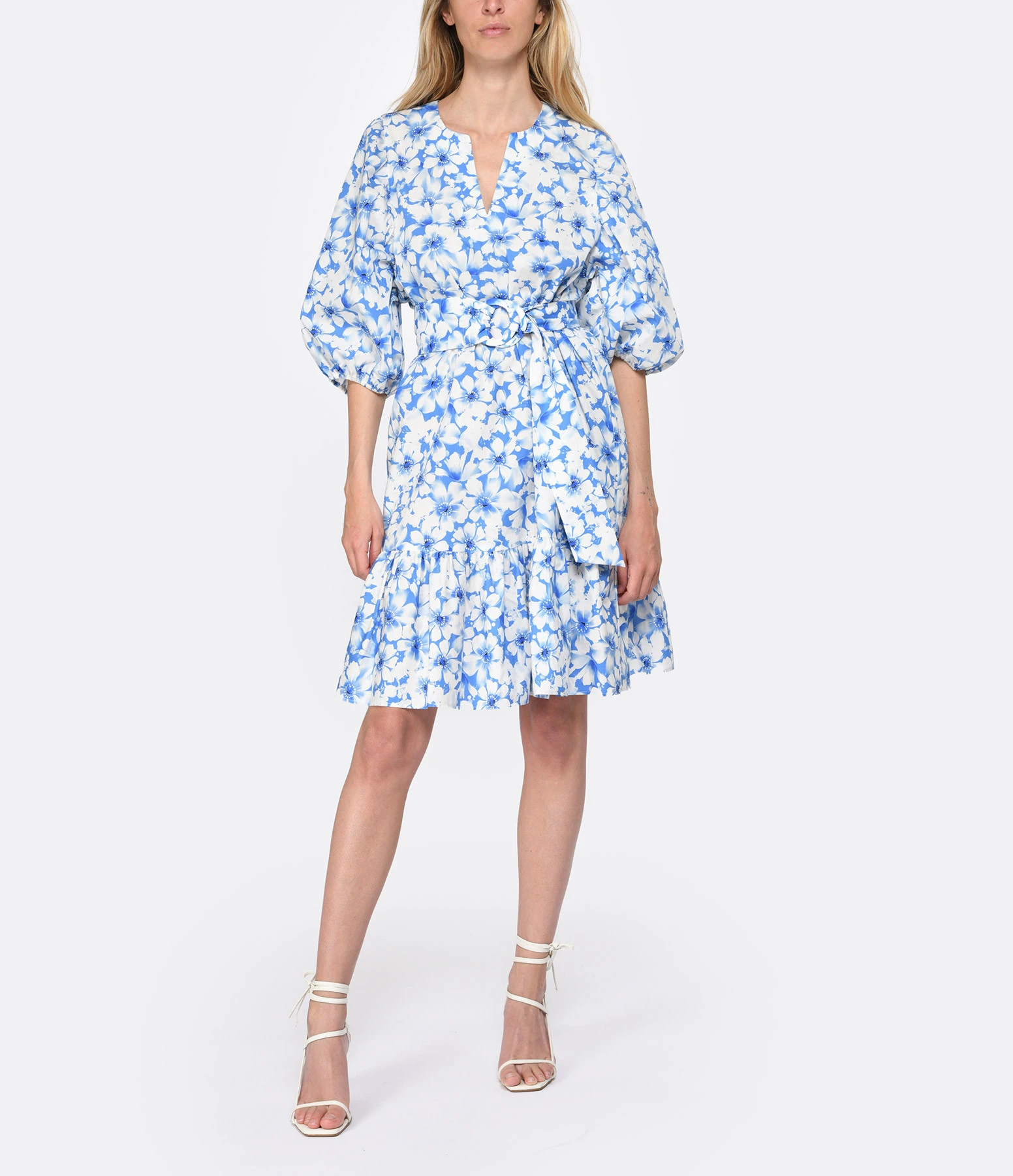 Robe courte en coton à imprimé fleuri bleu et blanc. Manches trois-quarts bouffantes. Col en V. Ceinture à imprimé assorti. Coupe évasée. Base volantée.