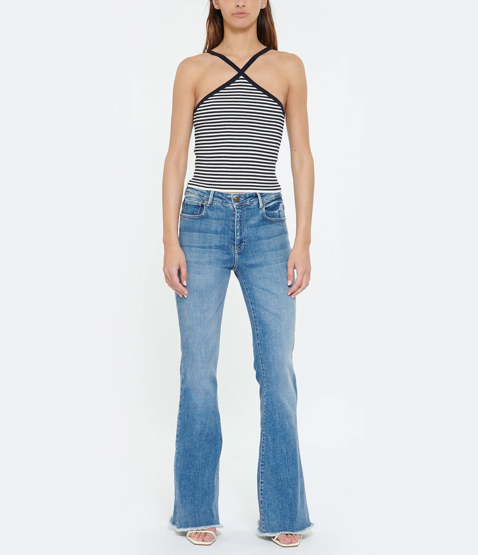 Top en maille noir et blanc à rayures. Encolure par bretelles croisées à l’avant. Coupe droite. Base droite.