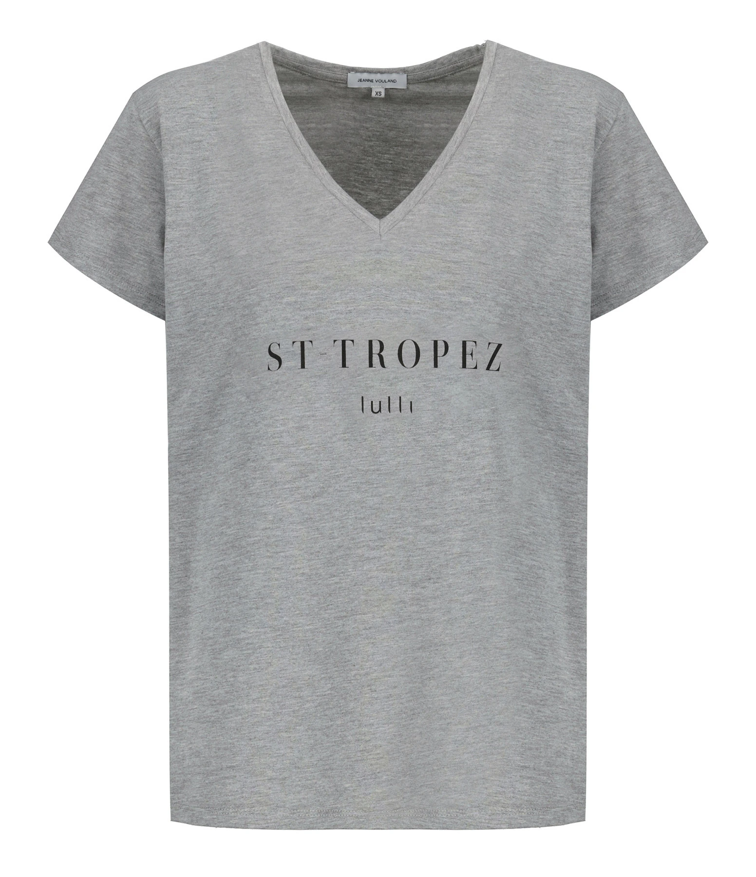 Tee-shirt en coton gris. Col V. Manches courtes. Sérigraphie « SAINT TROPEZ lulli » à l’avant. Coupe droite. Base droite.
