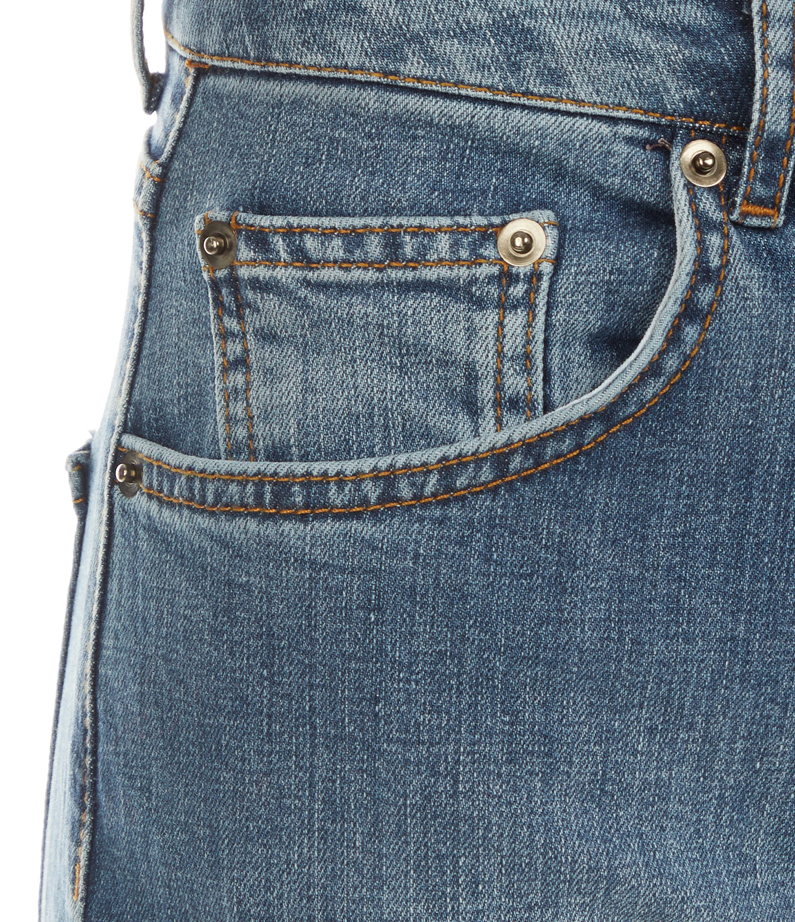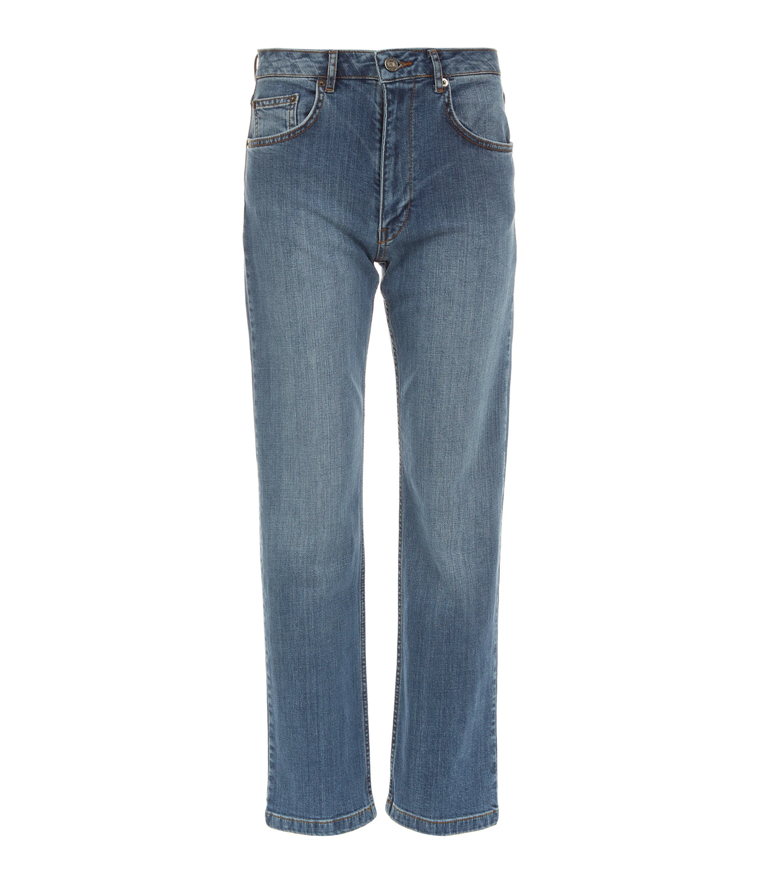 Jean slim droit en denim bleu. Cinq poches. Fermeture par zip et bouton.