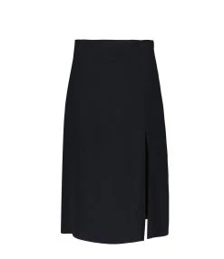 Jupe mi-longue noire fendue à gauche. Coupe évasée. Fermeture zippée invisible côté gauche.