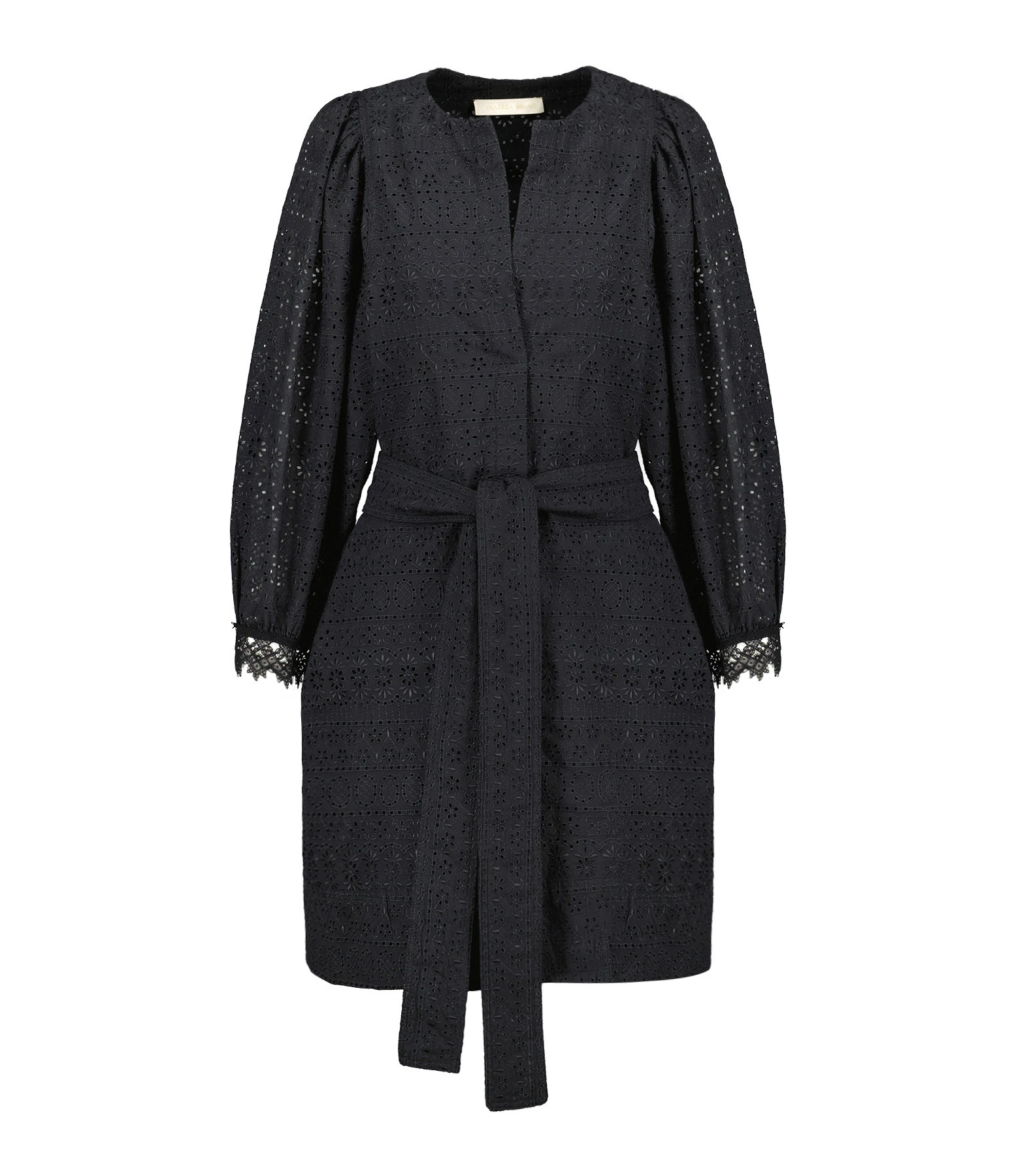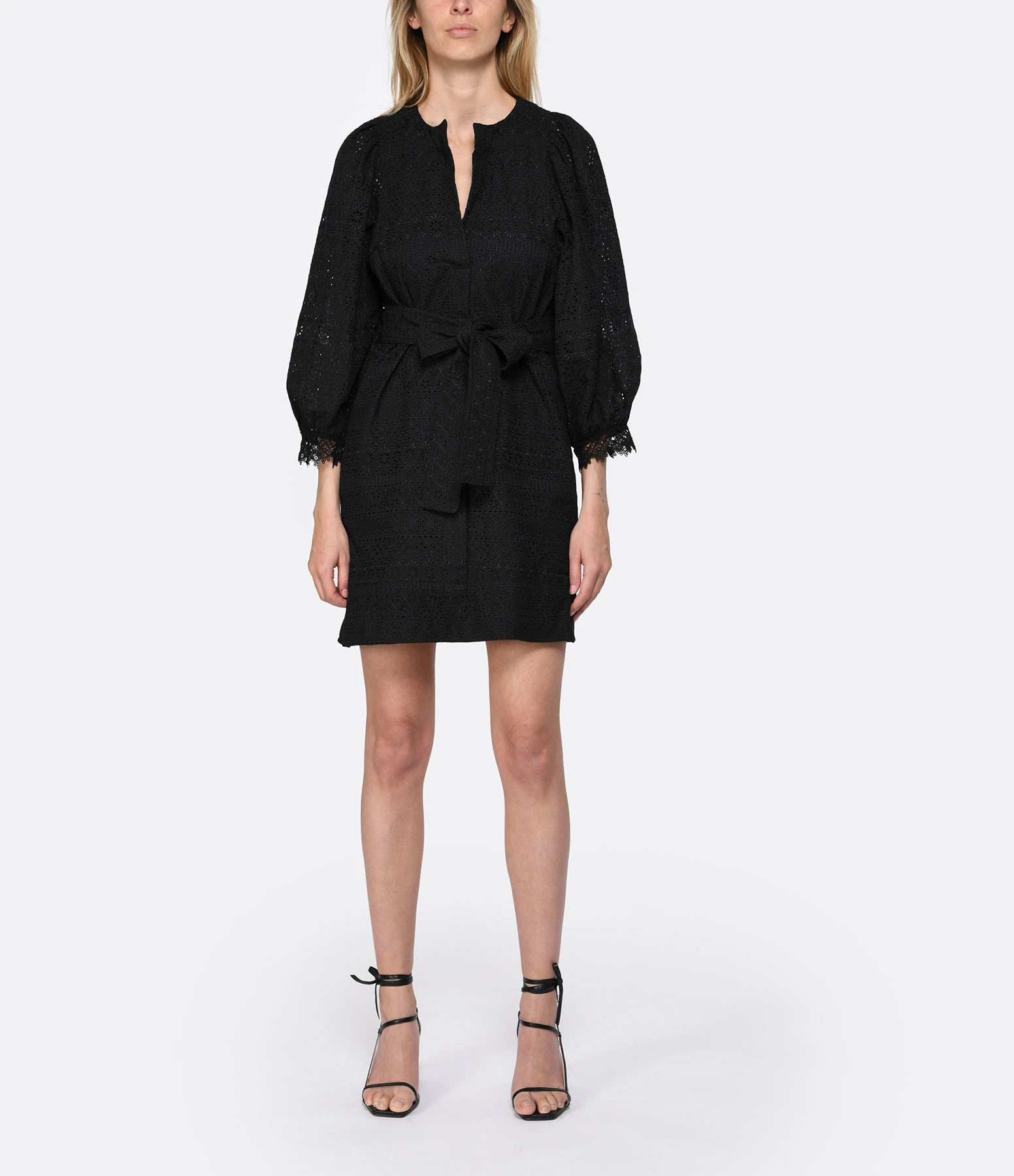 Robe courte brodée en coton noir. Manches 3/4 avec finition en dentelle. Deux poches prises dans les coutures. Coupe droite. Base droite. Ceinture amovible à la taille. Doublée.