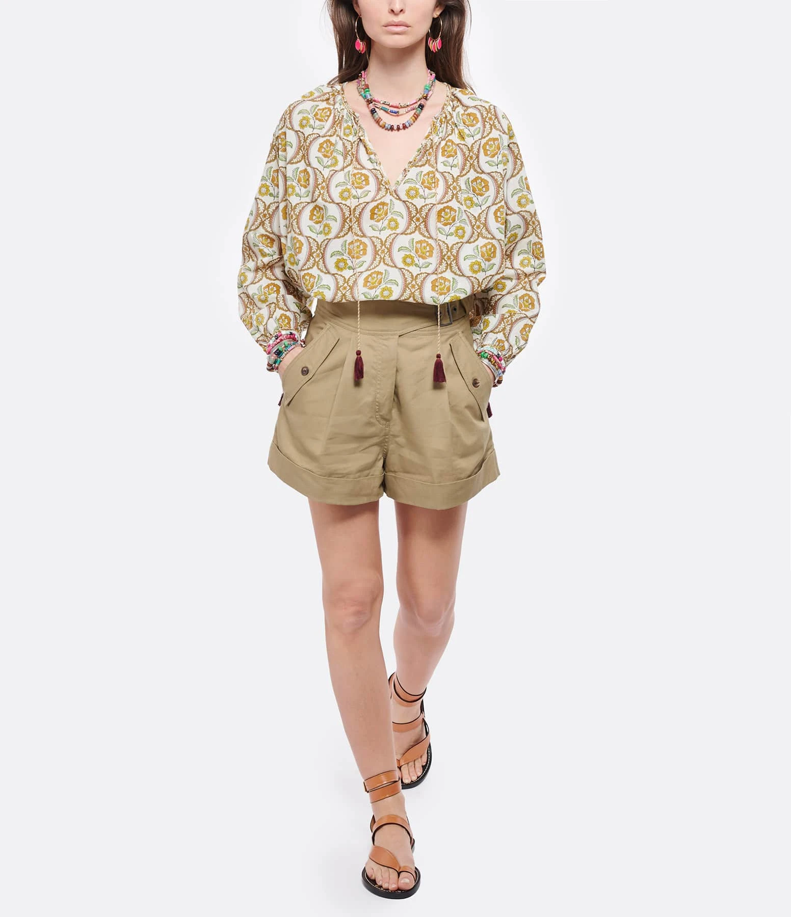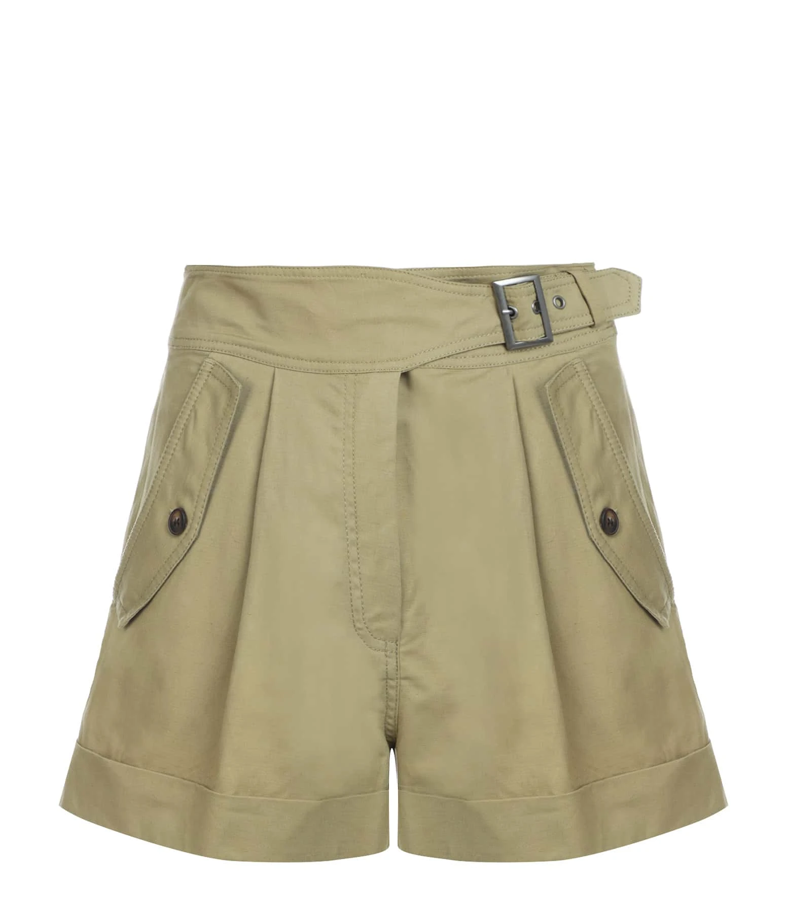 Short en coton kaki. Ceinturé à la taille sur le coté. Poches boutonnées à l’avant et une poche passepoilée à l’arrière.