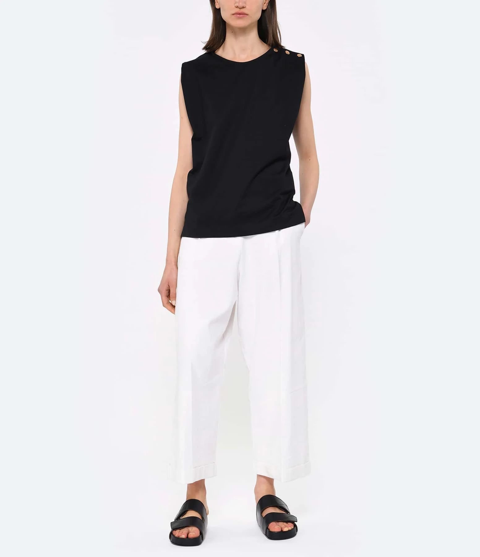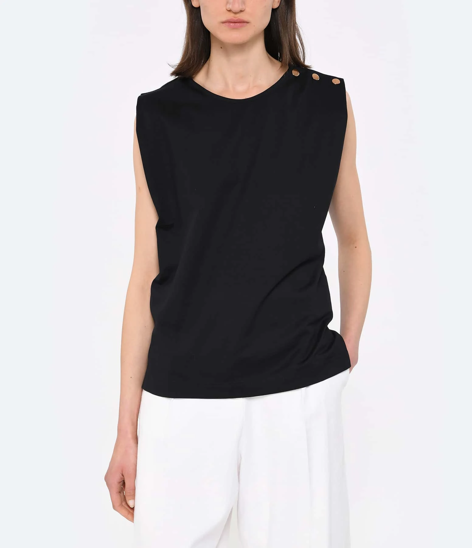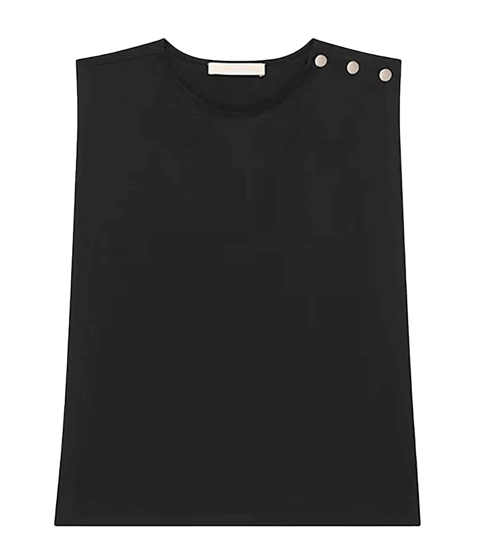 Top en coton noir. Col rond. Sans manches. Fermeture par trois boutons métalliques dorés sur l’épaule.