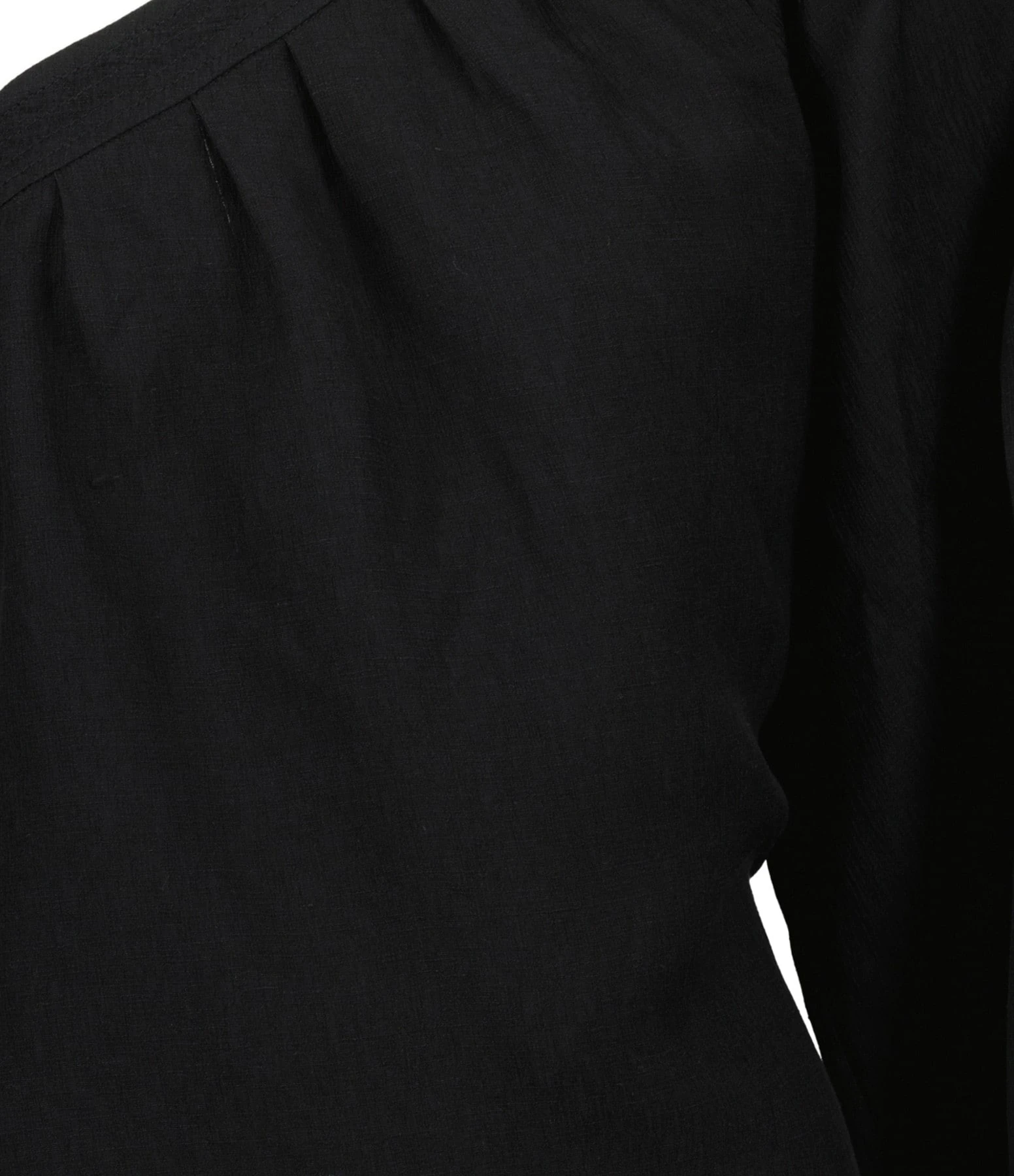 Top asymétrique en lin noir. Manche bouffante avec liens à nouer. Coupe ample. Base droite.