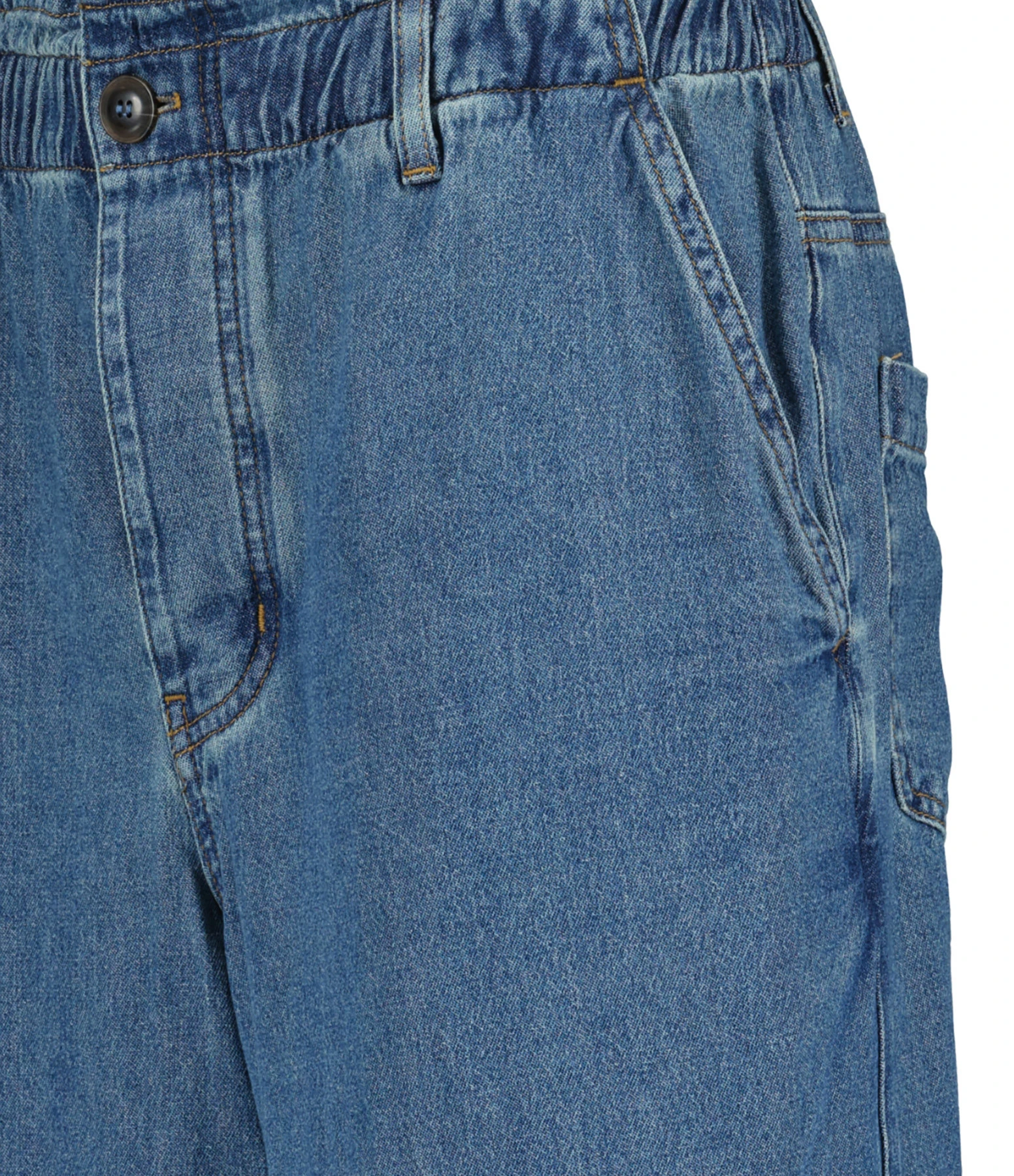 Pantalon en denim de coton bleu. Taille élastiquée et froncée avec passants pour ceinture. Fermeture boutonnée sur le devant. Boutons marron effet corne. Deux poches italiennes sur le devant. Deux poches plaquées dans le dos. Coupe large. Base droite.