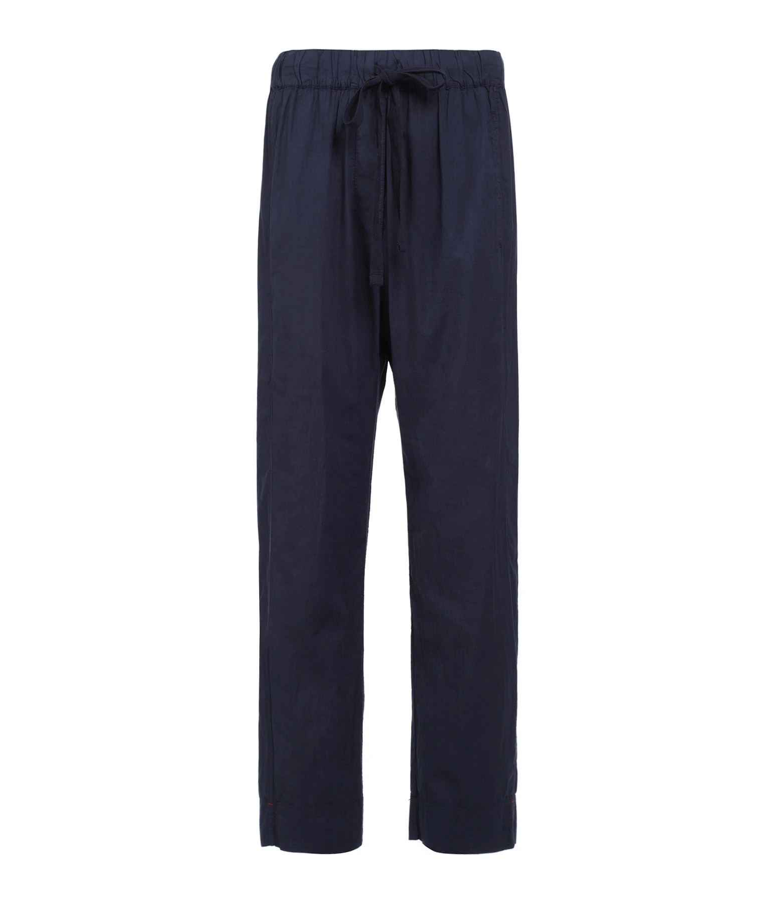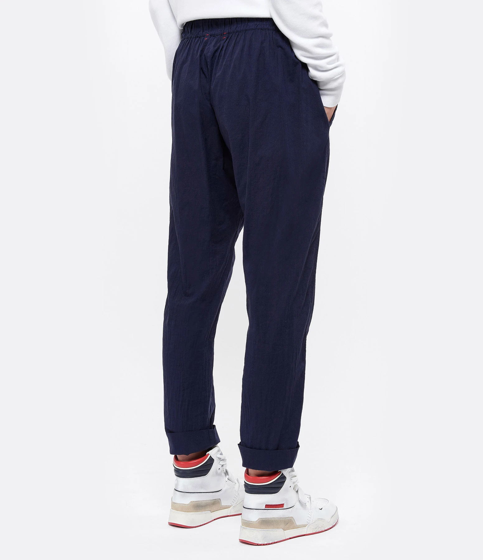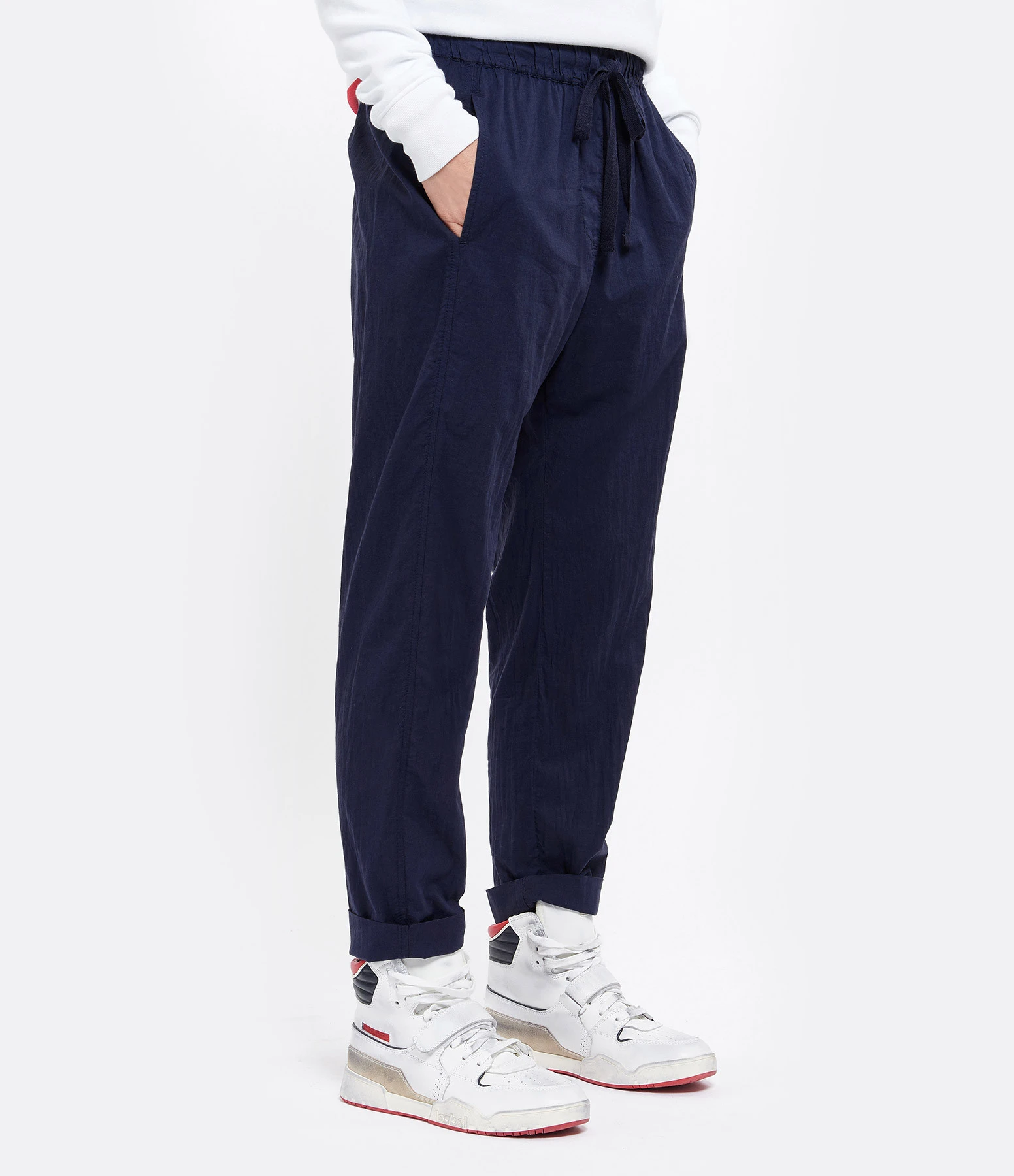 Pantalon en coton bleu. Taille élastiquée avec liens de serrage. Matière fluide et fine. Deux poches italiennes. Coupe droite.
