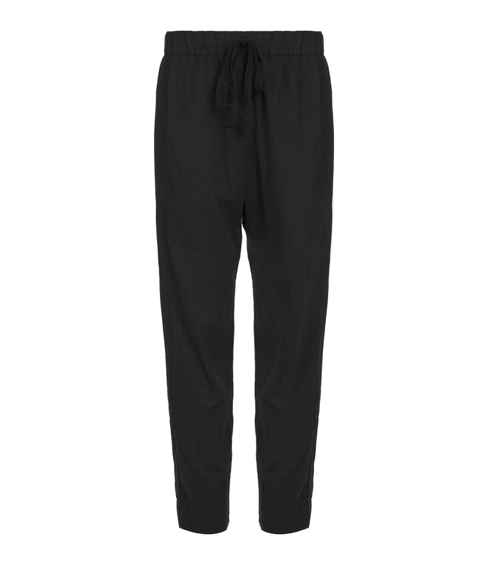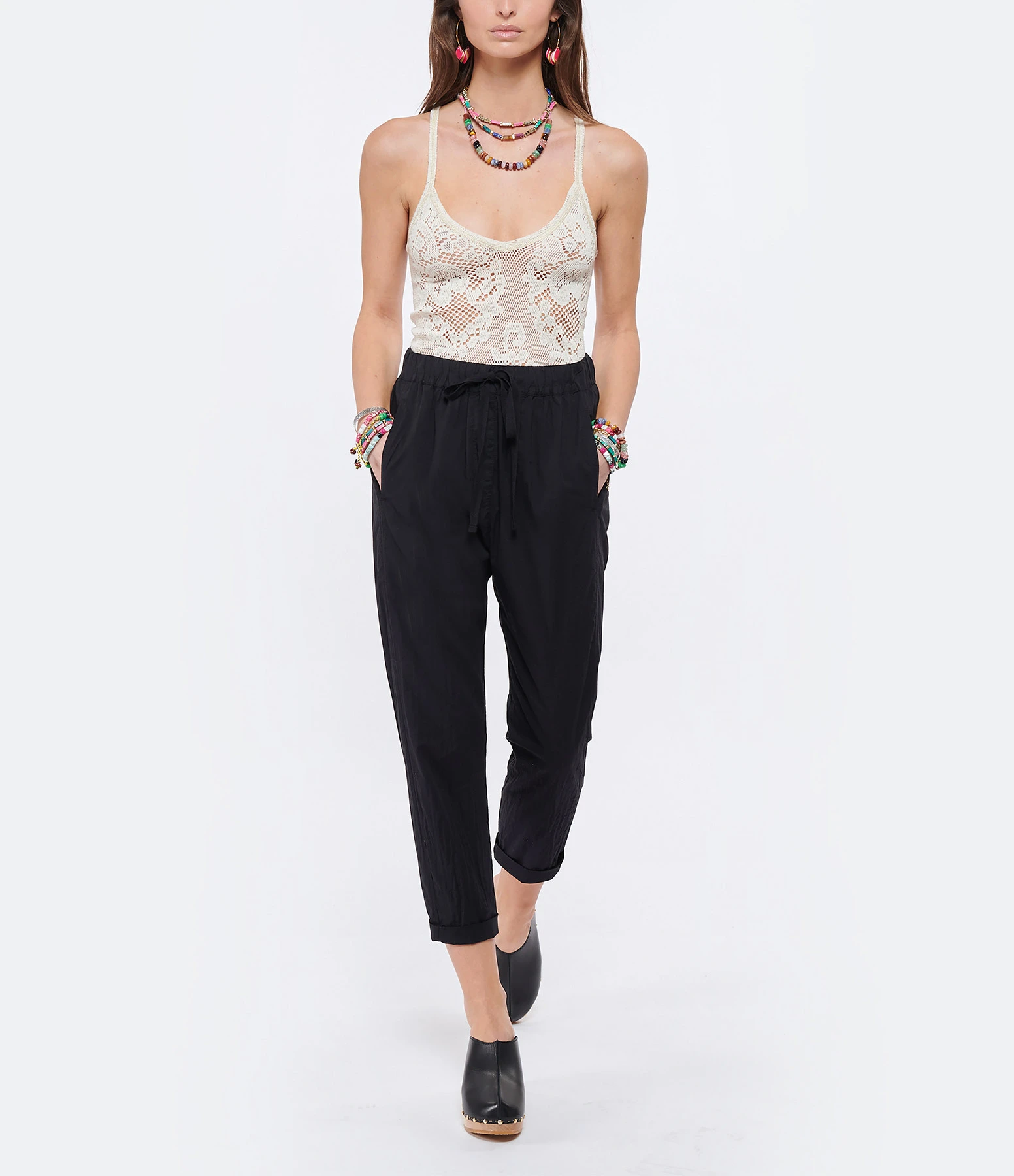 Pantalon en coton noir. Taille élastiquée avec liens de serrage. Deux poches italiennes. Non doublé.