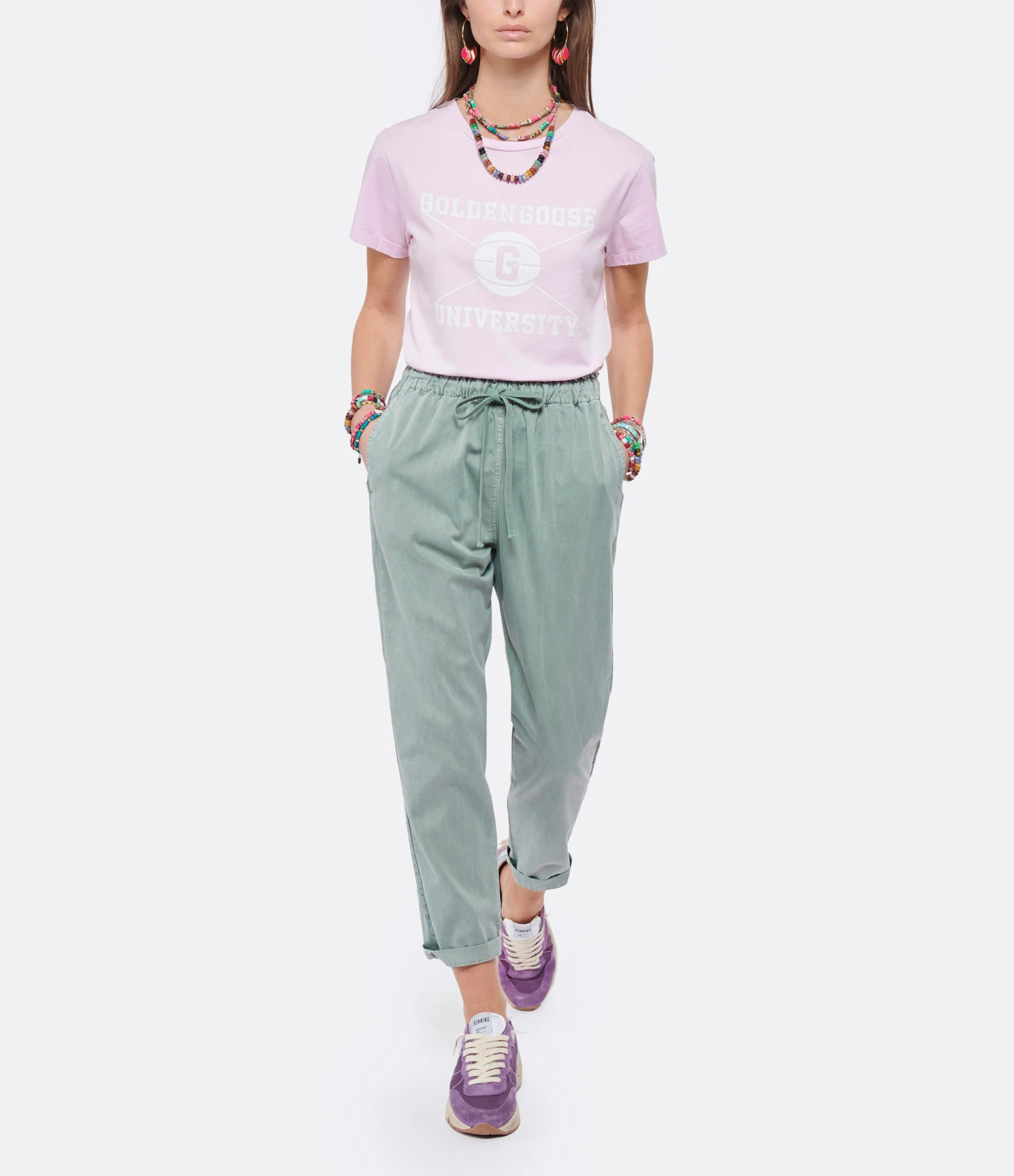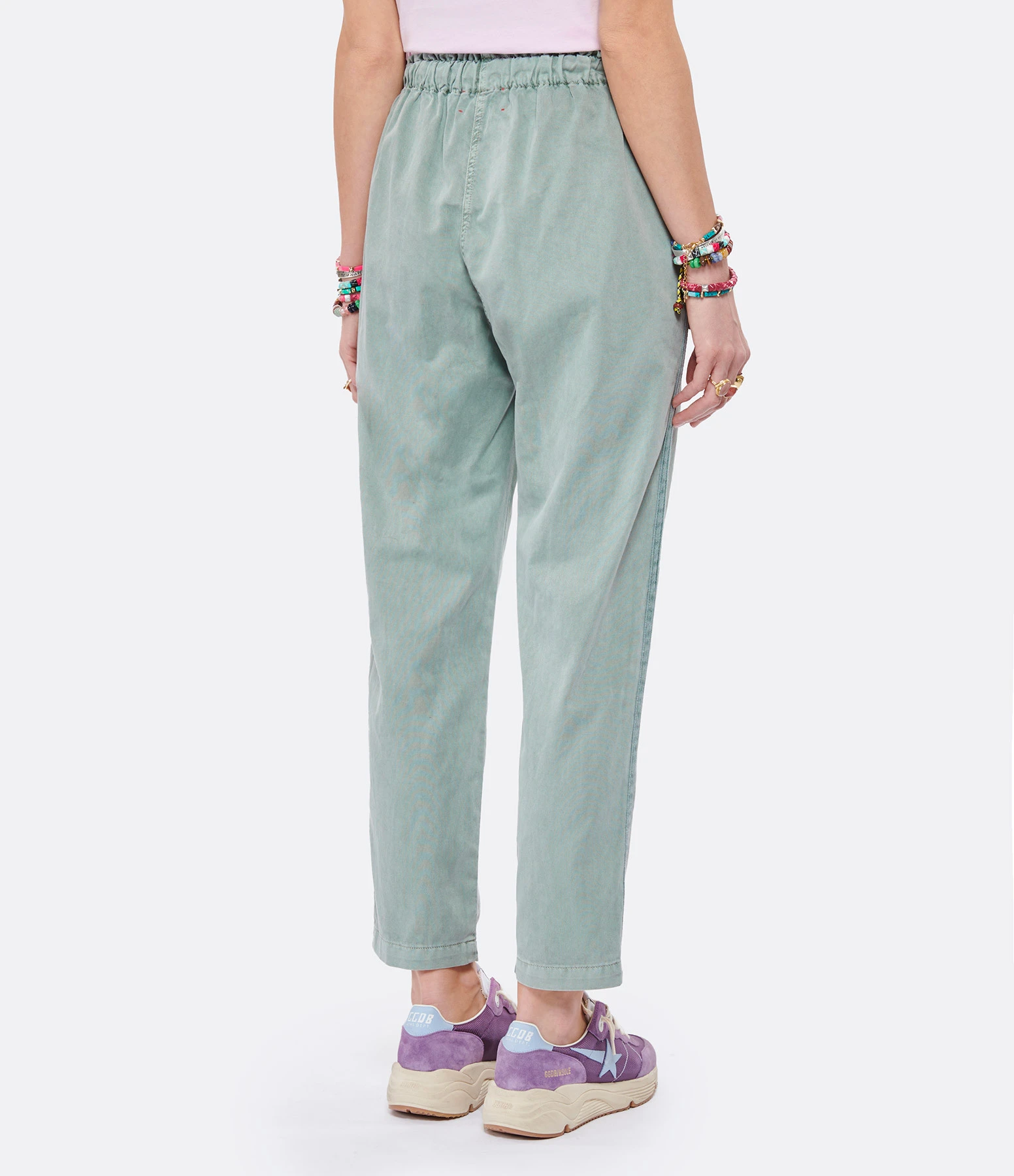 Pantalon en coton vert. Taille élastiquée avec liens de serrage. Deux poches fendues sur les côtés. Bordures vertes sur les côtés. Coupe droite.