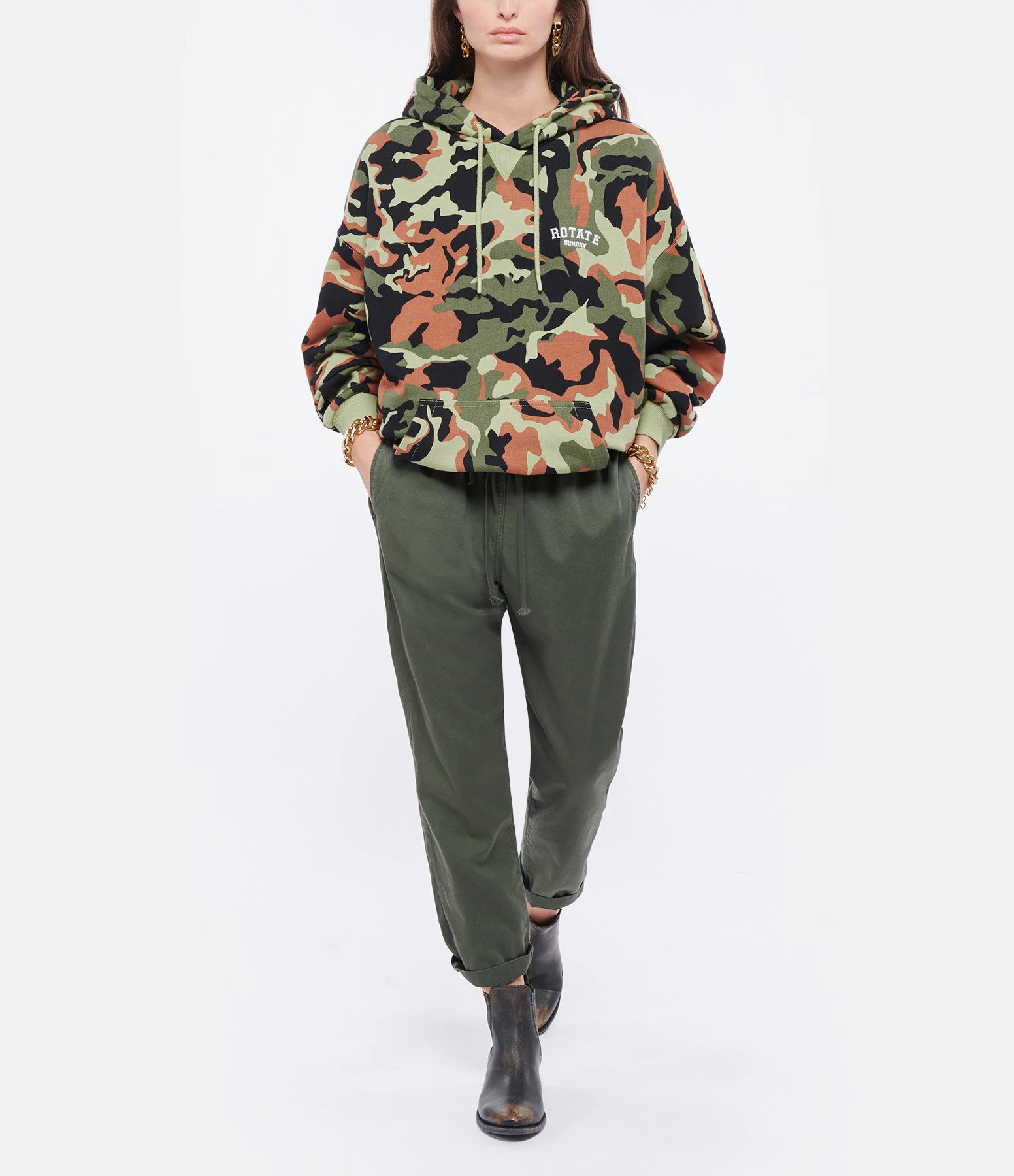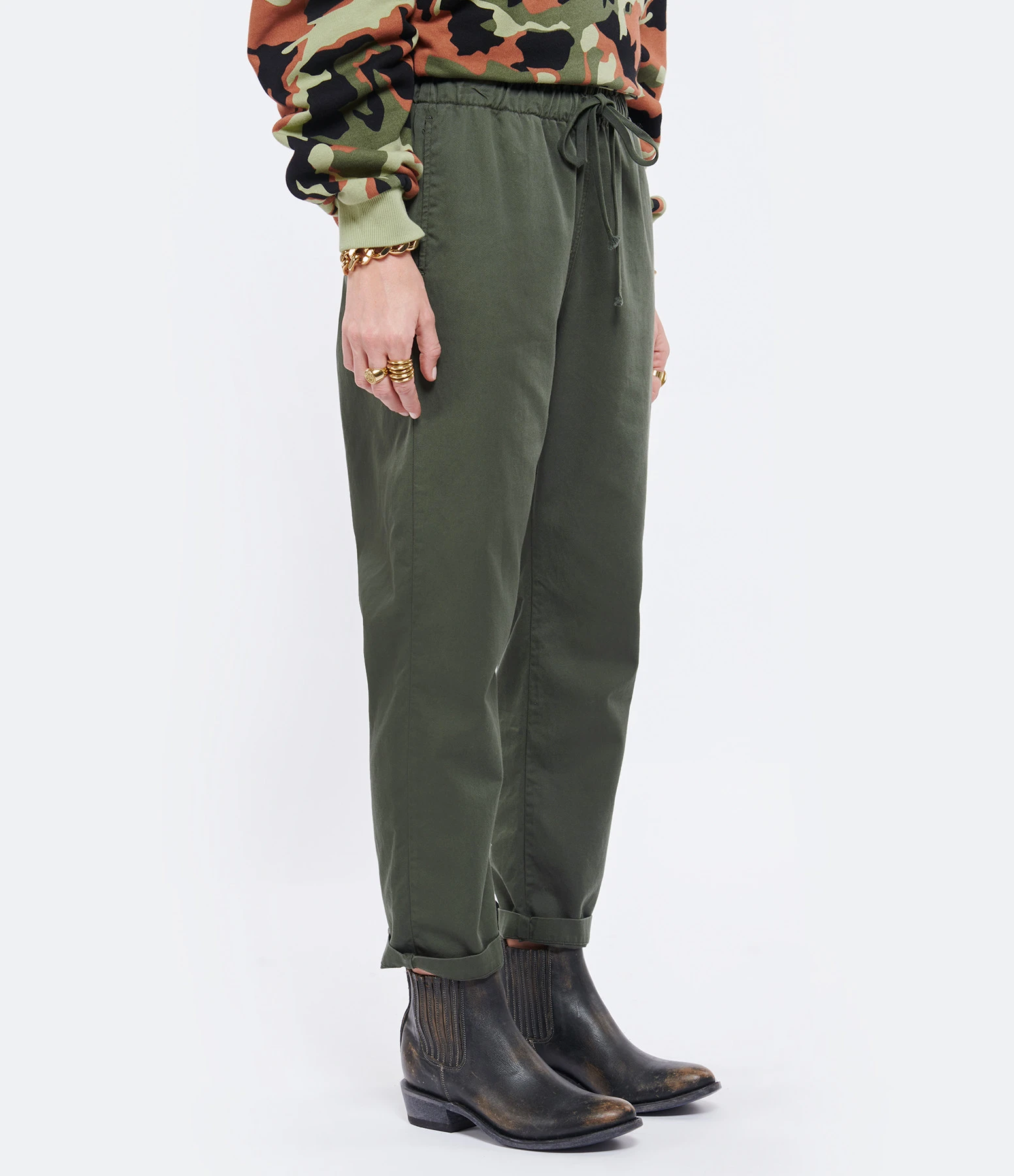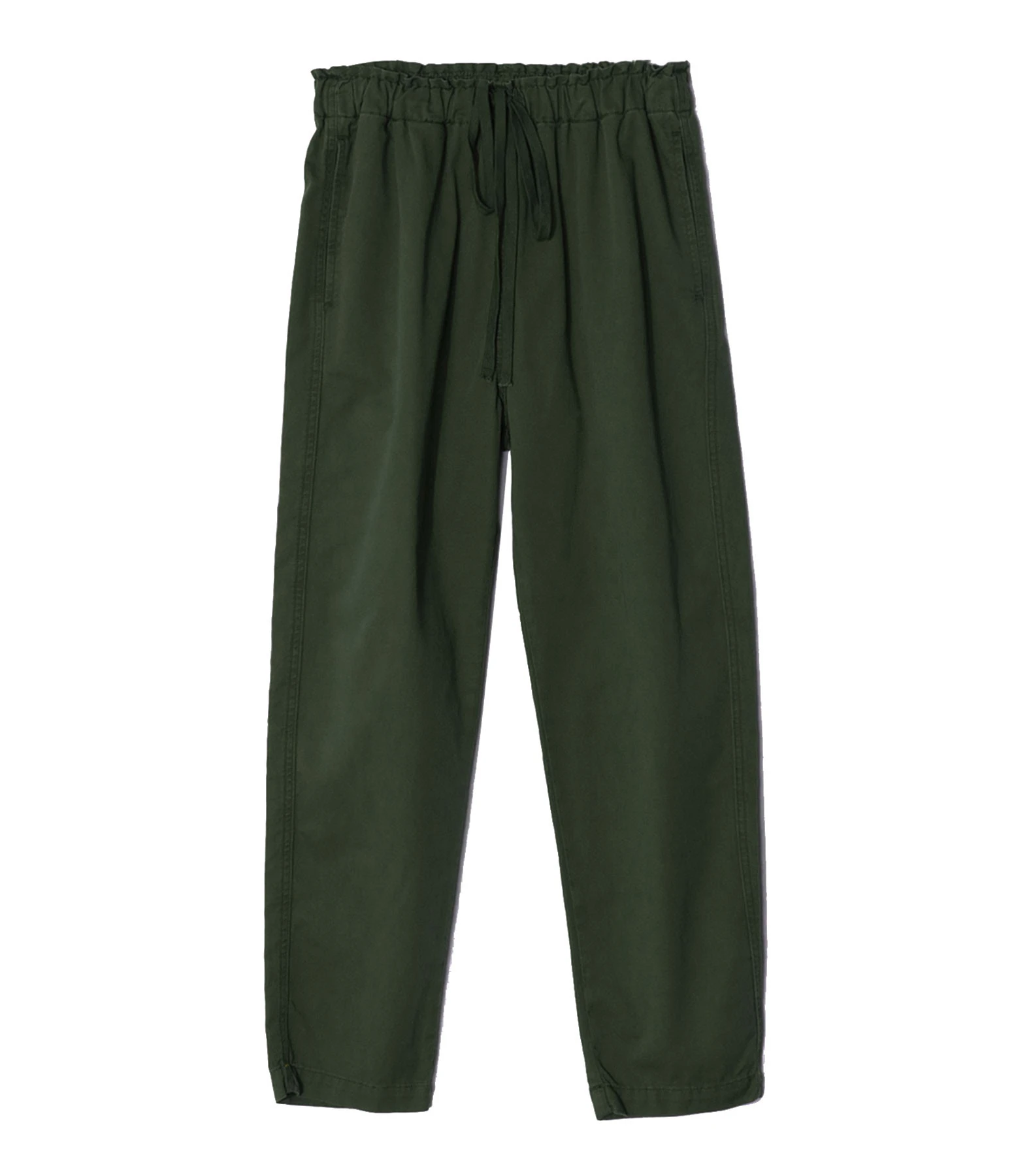 Pantalon en coton vert foncé. Taille élastiquée avec liens de serrage. Deux poches italiennes. Coupe droite.
