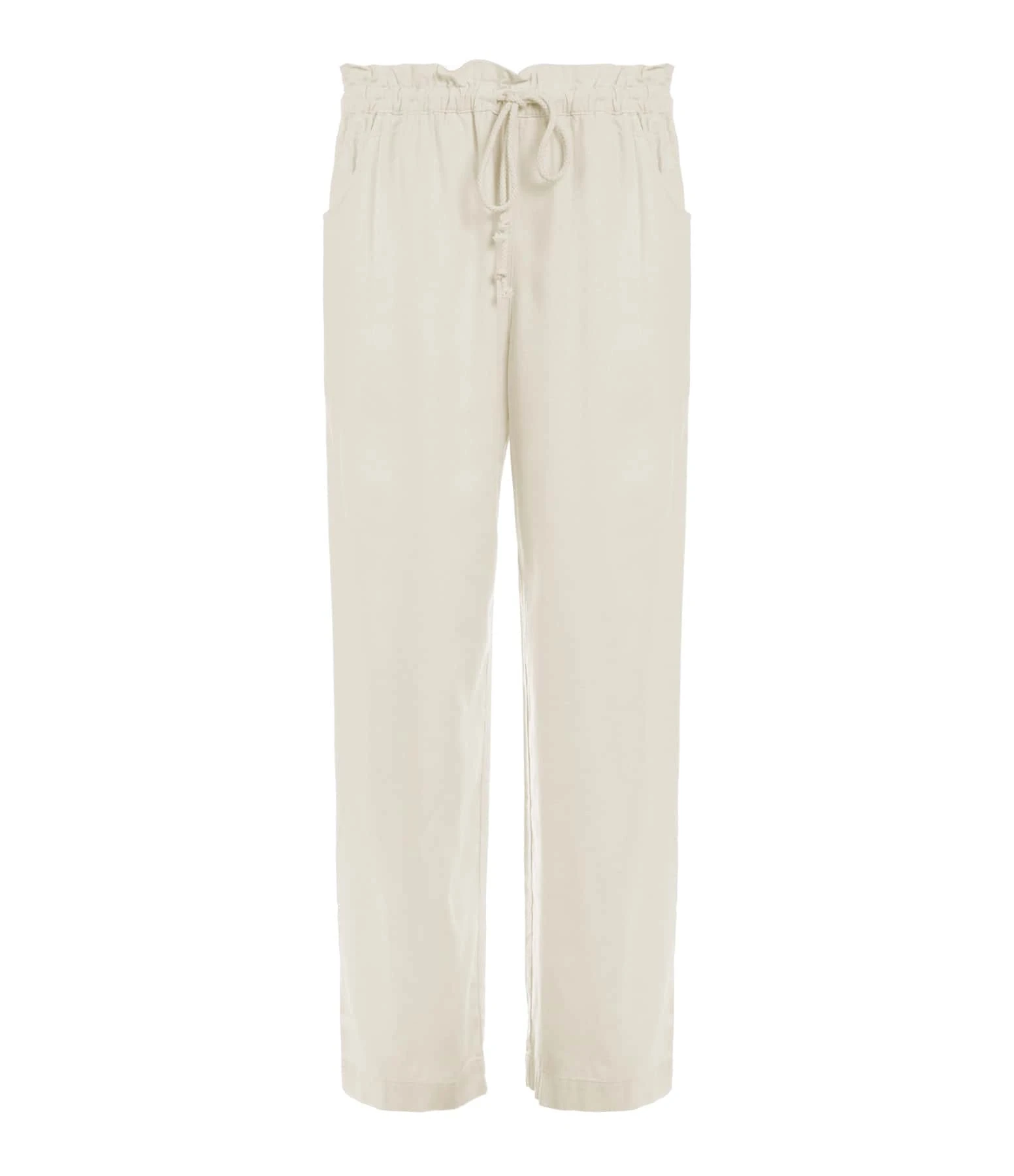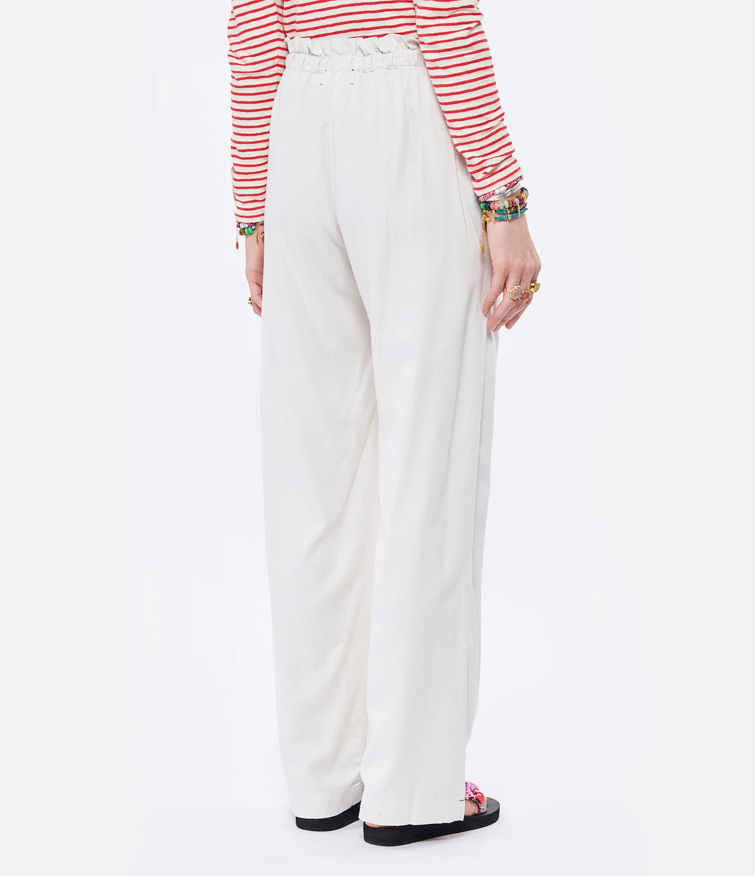 Pantalon droit en soie écru. Liens de serrage à la taille. Deux poches cavalières. Coupe droite.