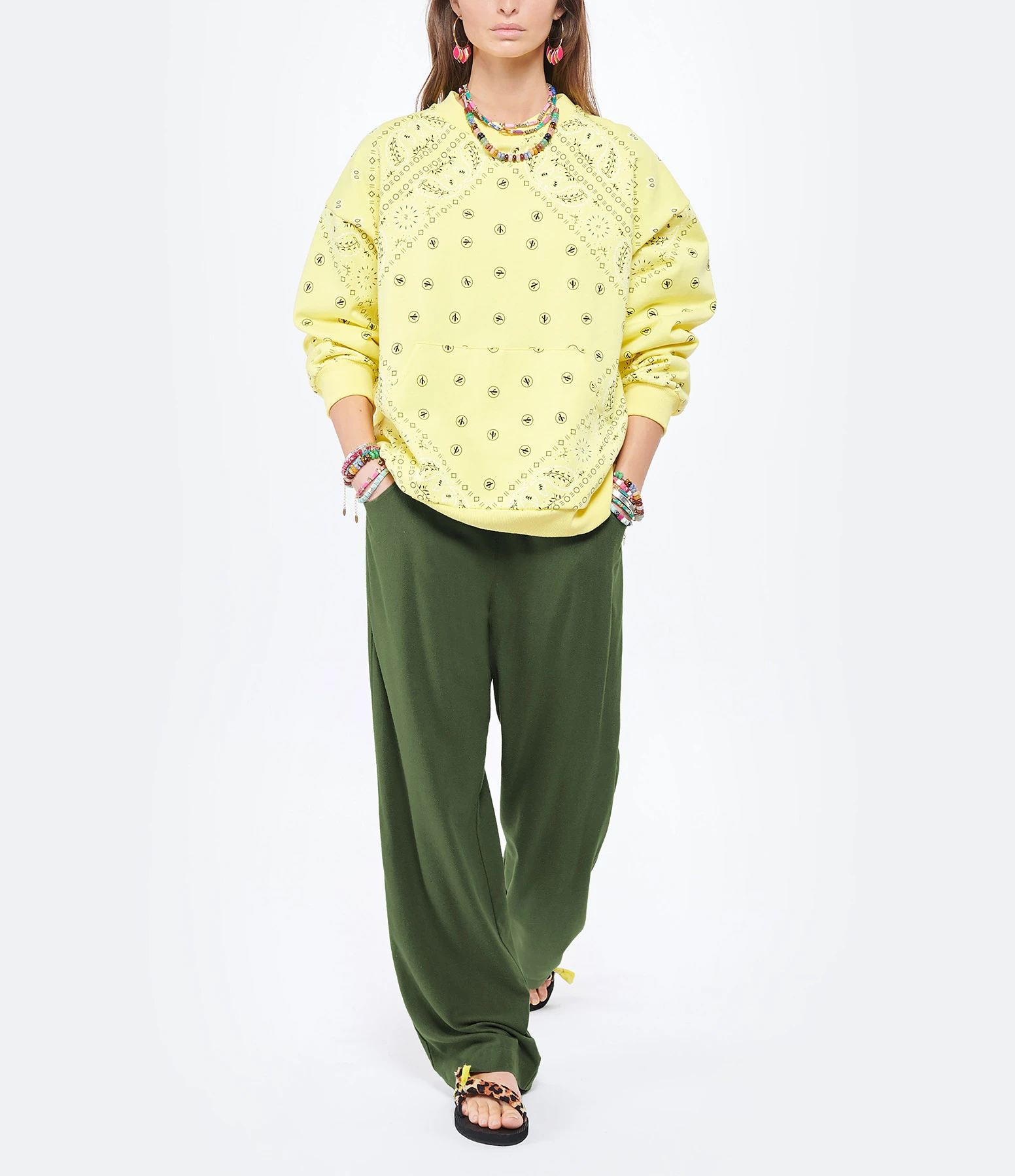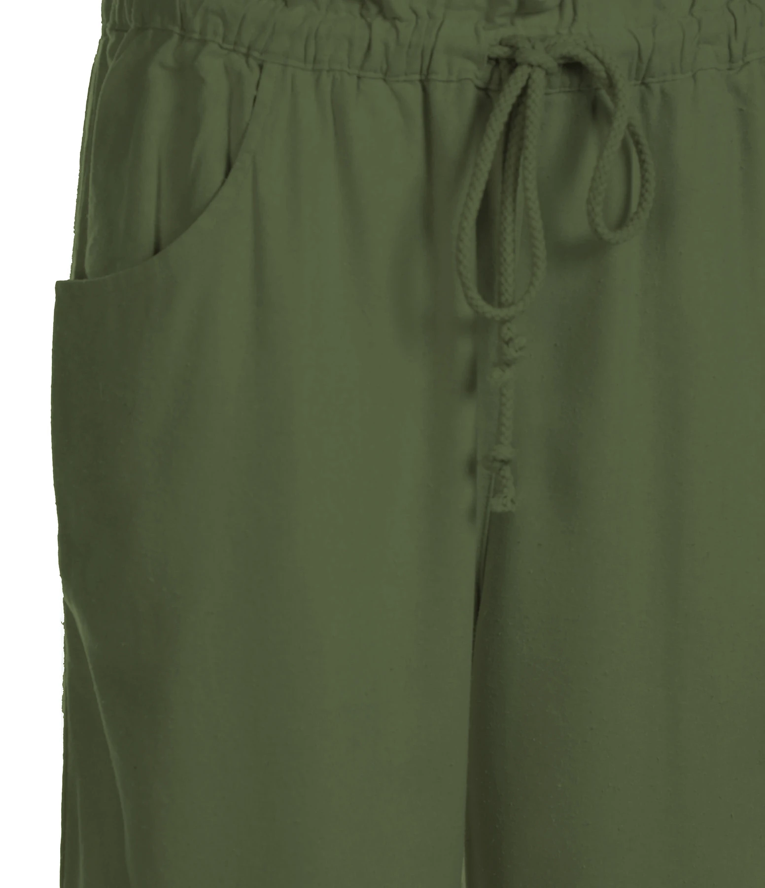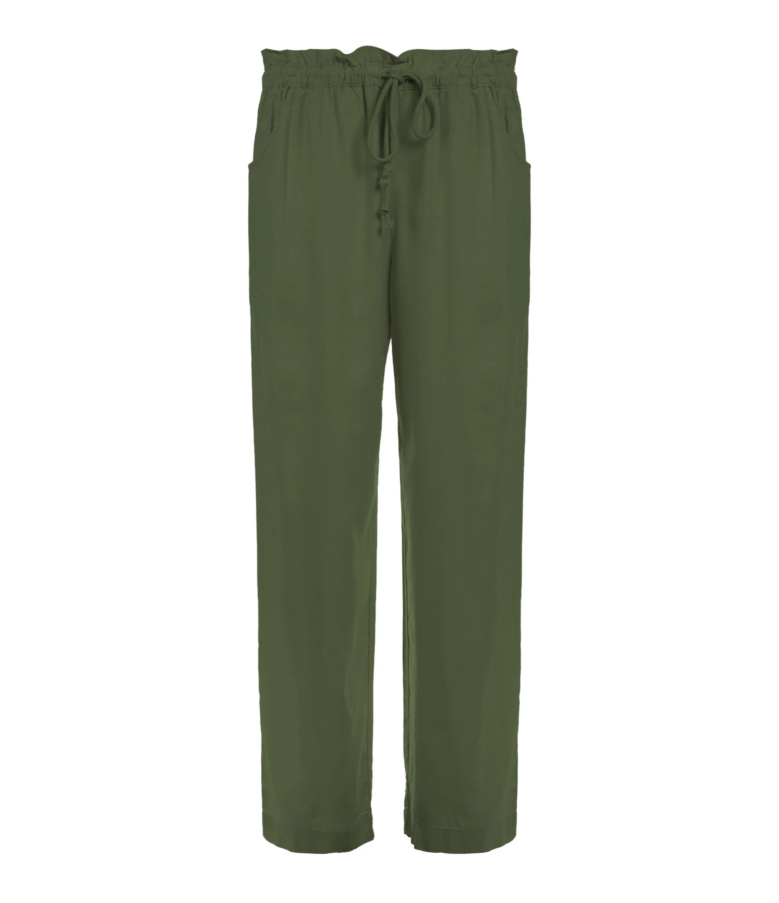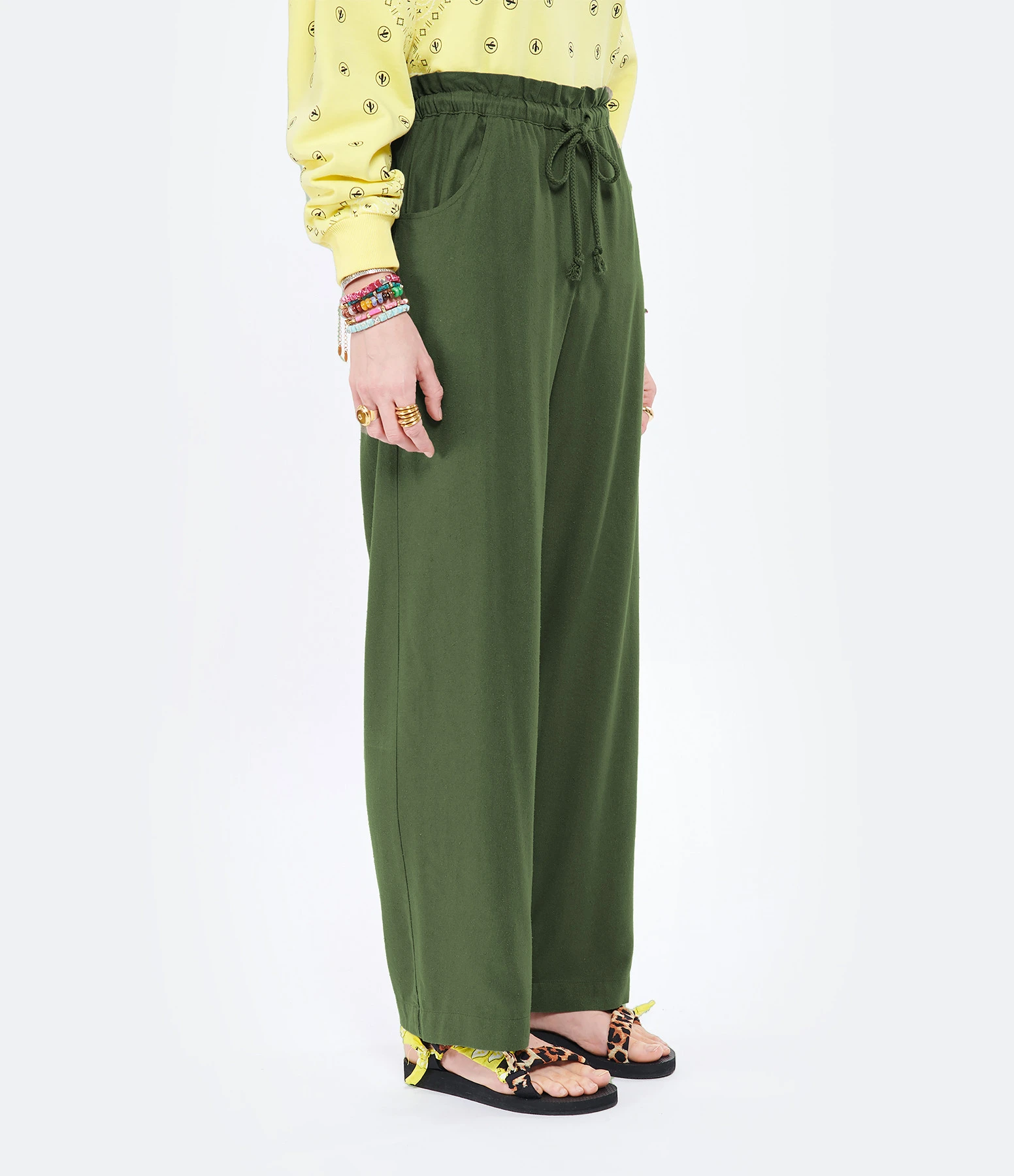 Pantalon droit en soie kaki. Liens de serrage à la taille. Deux poches cavalières. Coupe droite.