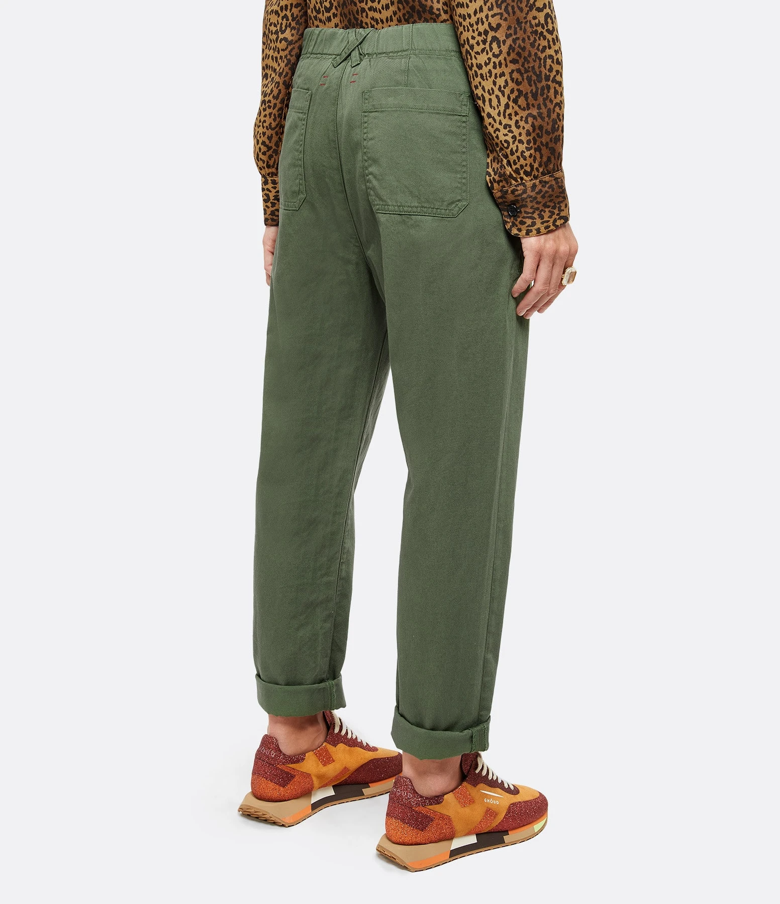 Pantalon en coton kaki. Quatre poches. Fermeture par zip. Coupe droite.