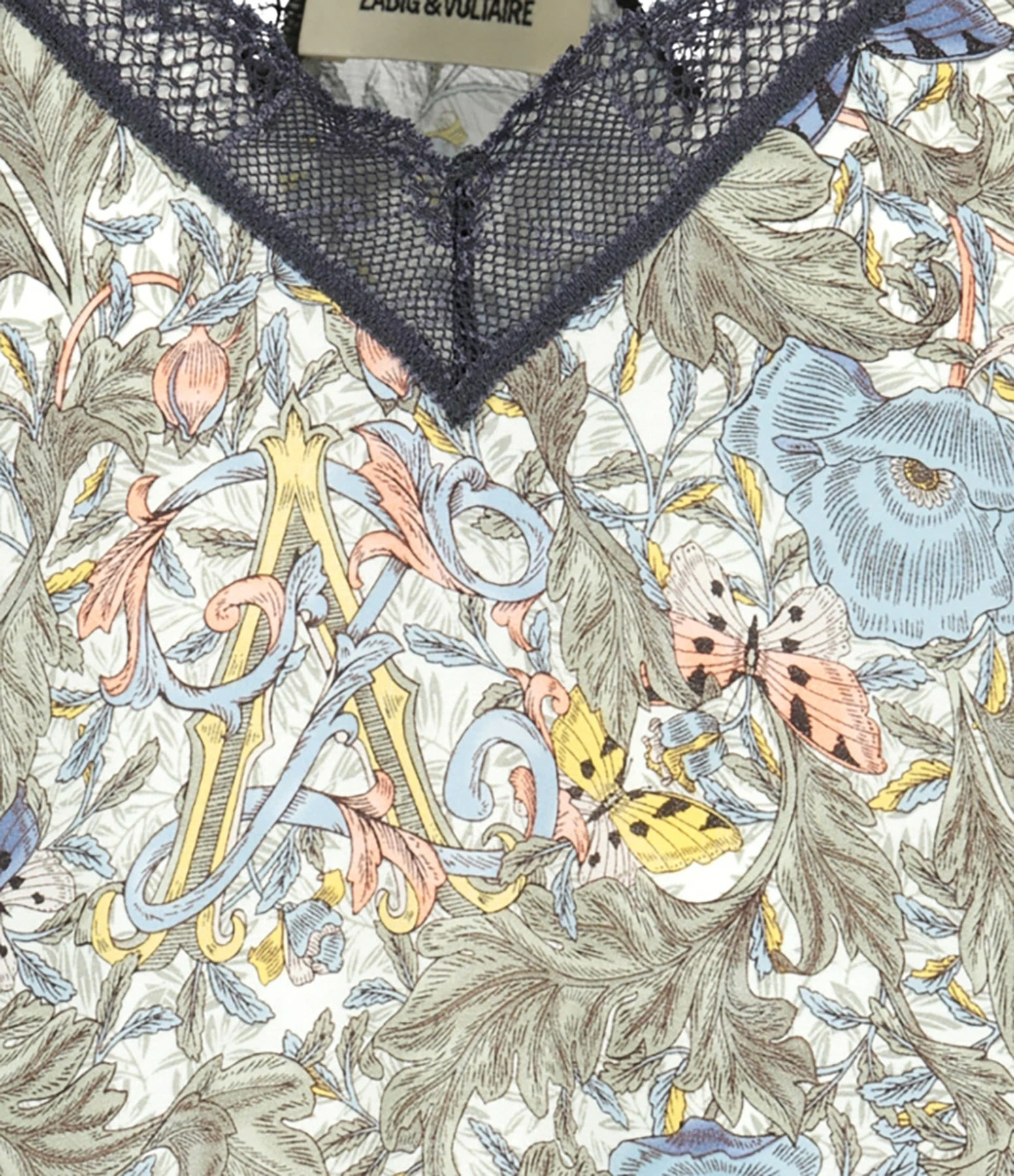 Caraco à imprimé multicolore orné de dentelle grise. Col en V. Bretelles croisées au dos. Base arrondie et dentelée.