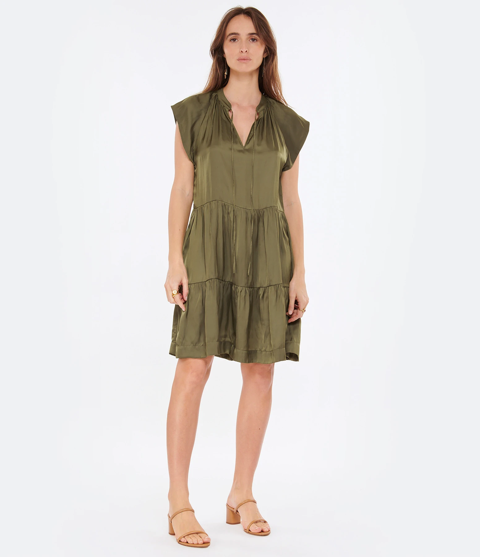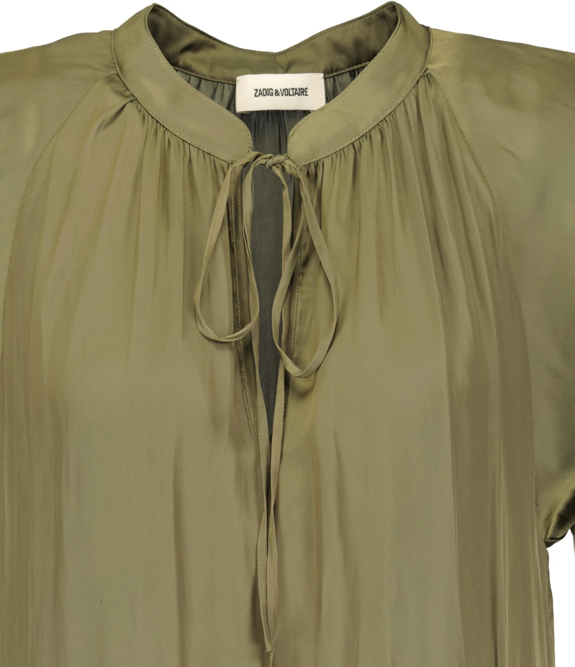Robe courte verte. Col en V avec cordon de serrage. Manches courtes. Plissée à la taille et aux épaules. Coupe droite. Base droite.