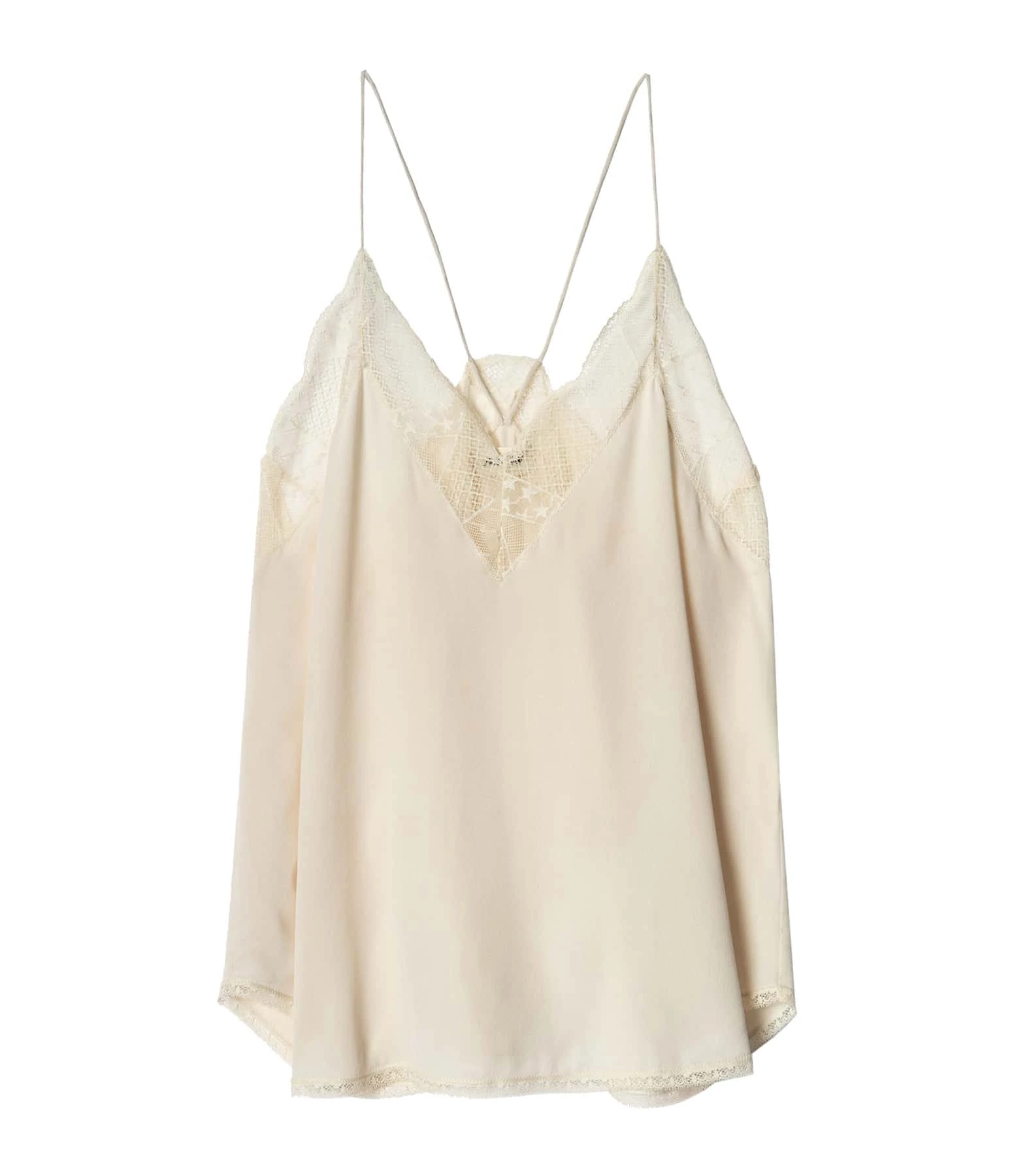 Top caraco en soie beige, orné de dentelle. Col en V. Bretelles croisées dans le dos. Base arrondie et dentelée.