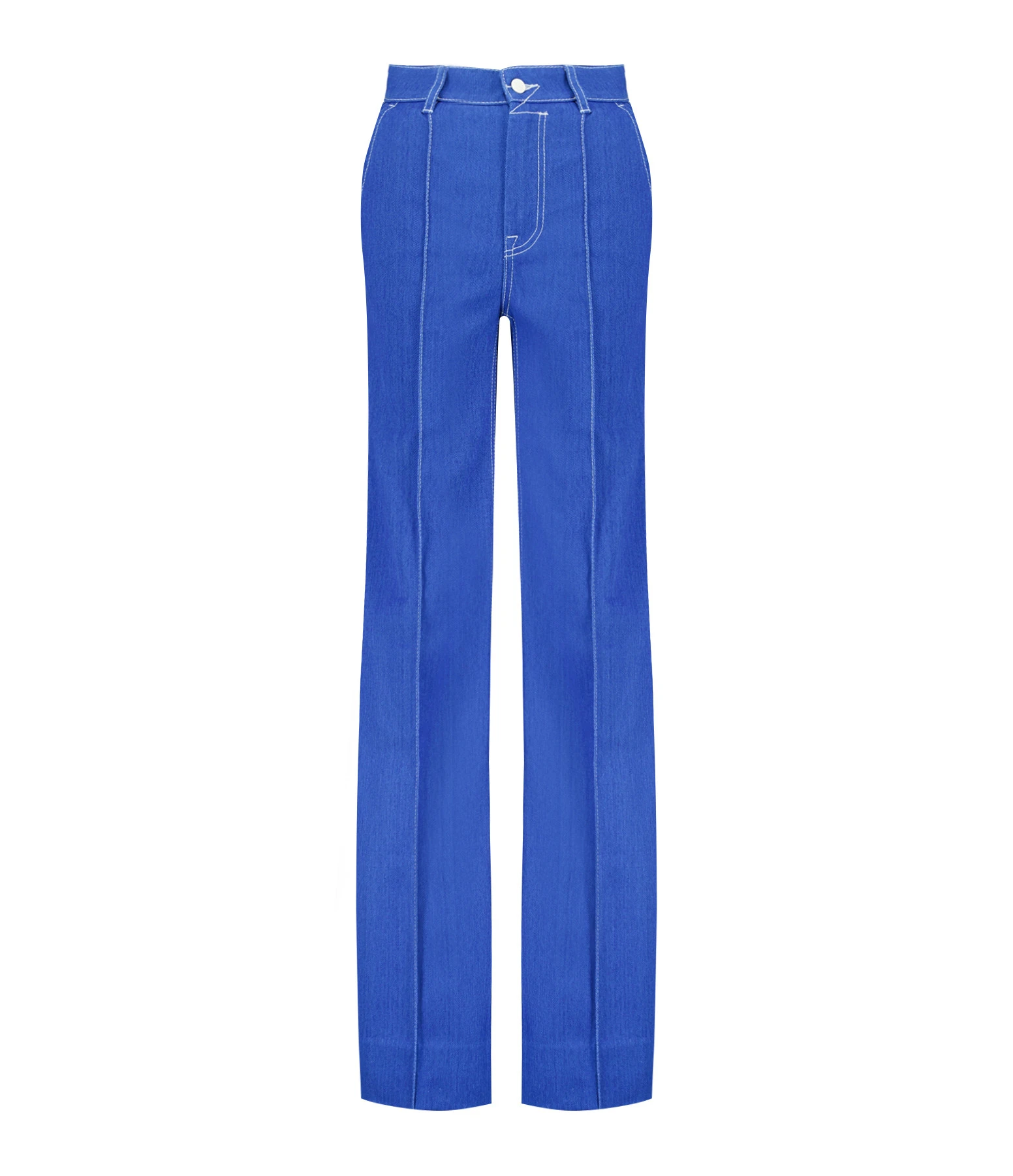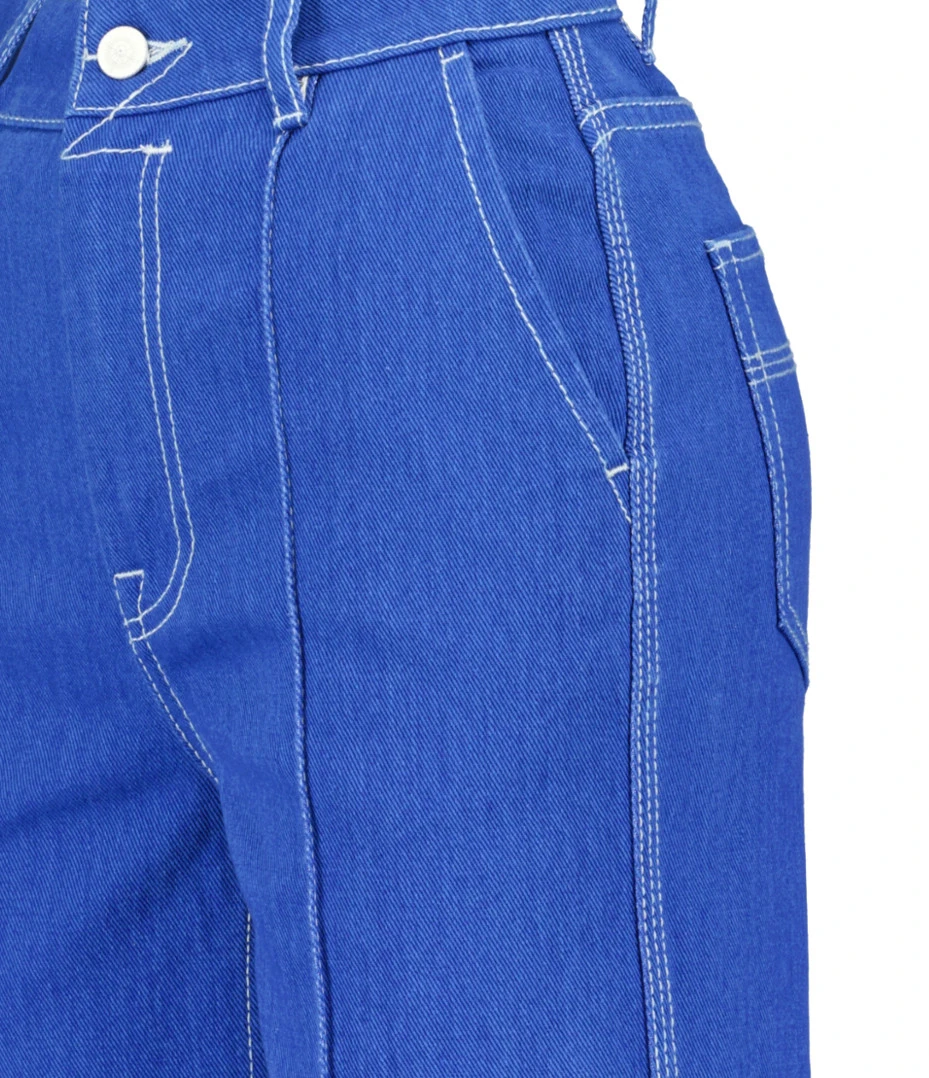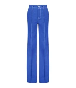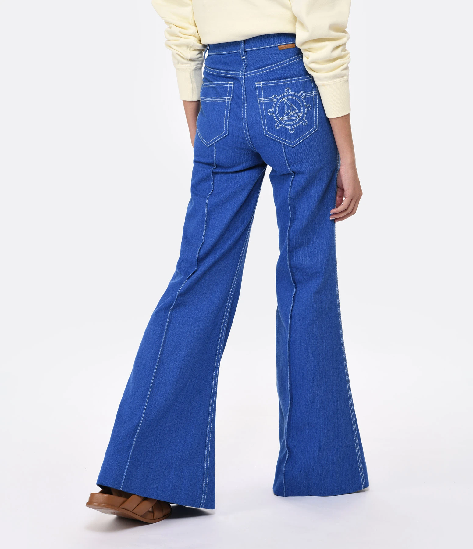Jean évasé en denim de coton bleu. Imprimé voilier brodé en blanc sur la poche droite arrière. Coutures apparentes blanches. Quatre poches. Passants pour ceinture. Braguette zippée et boutonnée. Coupe évasée. Base droite.