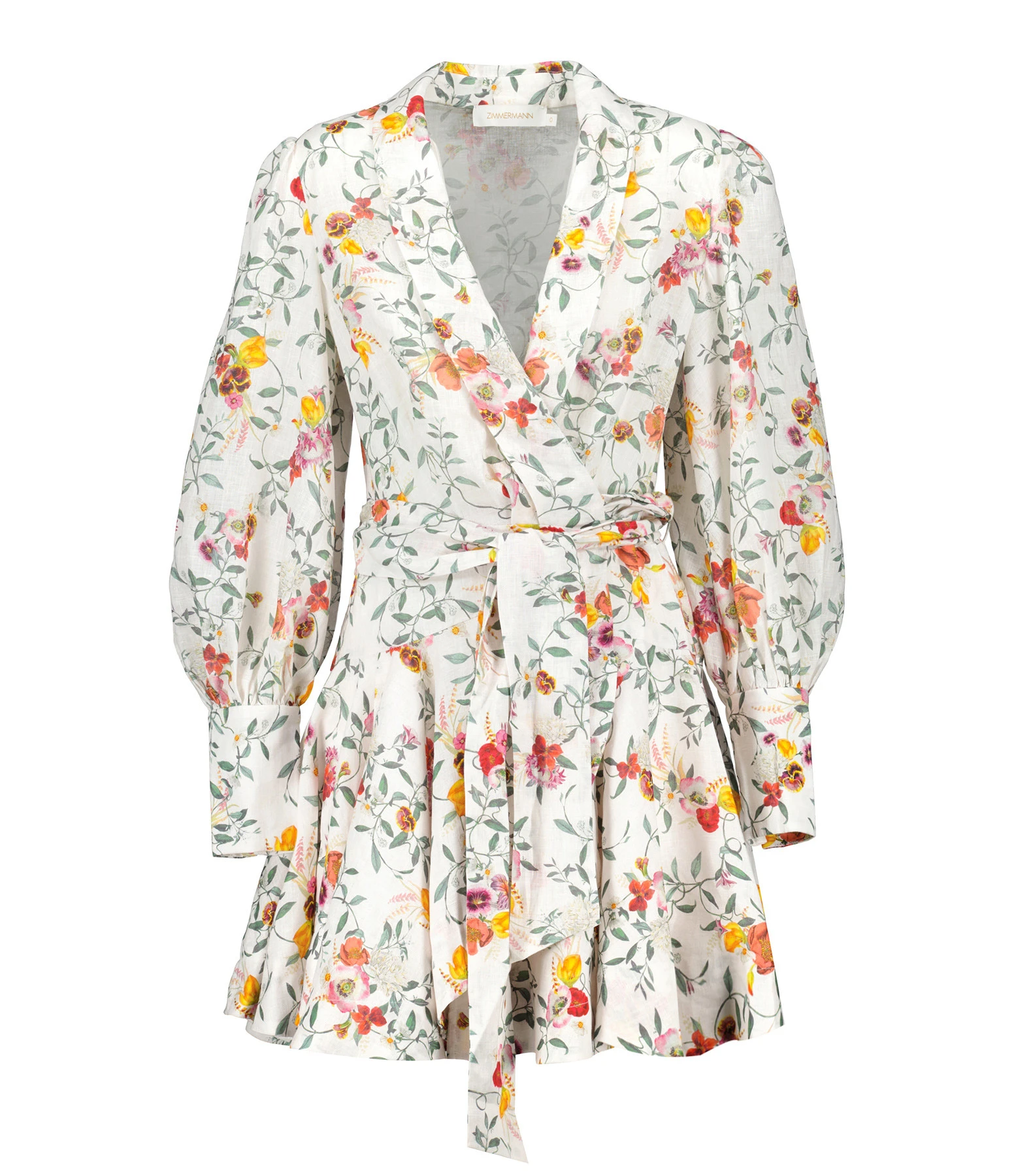 Robe courte en lin à imprimé fleuri multicolore sur fond blanc. Fermeture portefeuille à la taille par ceinture imprimée à nouer. Décolleté plongeant portefeuille en V. Manches longues resserrées aux poignets par boutons dorés et blancs. Coupe évasée. Base asymétrique.
