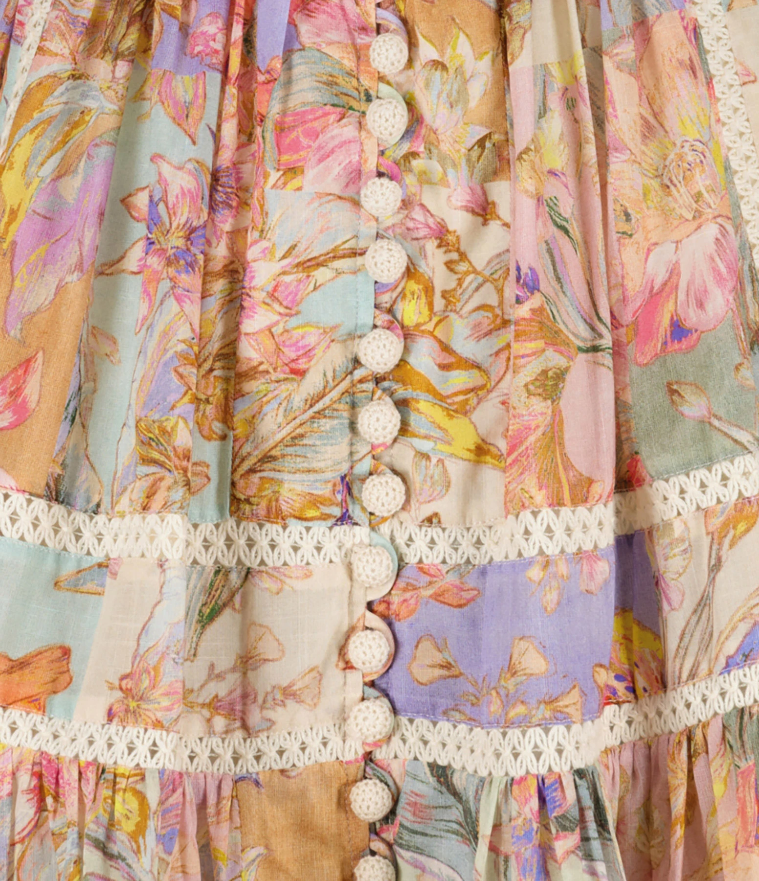 Robe courte en lin à imprimé floral multicolore. Col en V avec contour en dentelle. Manches trois-quarts bouffantes. Poignets élastiqués. Fermeture boutonnée sur le devant. Fermeture zippée invisible dans le dos. Coupe buste cintrée. Coupe jupe évasée. Base droite. Doublée en coton.