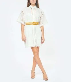 Robe de plage en crochet de coton et chanvre beige. Col en V. Capuche avec liens de serrage à pompons. Manches 7/8 avec bords frangés. Coupe droite. Base droite frangée.