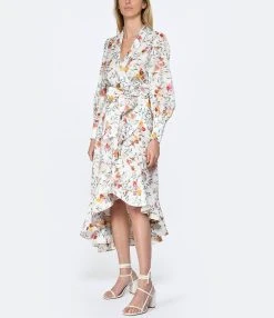 Robe courte portefeuille en soie vert clair. Encolure cache-cœur. Manches longues bishop avec poignets zippés. Taille avec passants pour ceinture assortie à nouer pour une silhouette plus ajustée. Coupe jupe évasée asymétrique. Base arrondie. Non doublée.