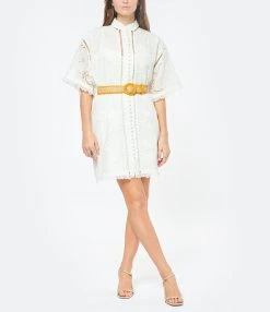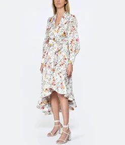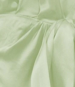 Robe courte portefeuille en soie vert clair. Encolure cache-cœur. Manches longues bishop avec poignets zippés. Taille avec passants pour ceinture assortie à nouer pour une silhouette plus ajustée. Coupe jupe évasée asymétrique. Base arrondie. Non doublée.